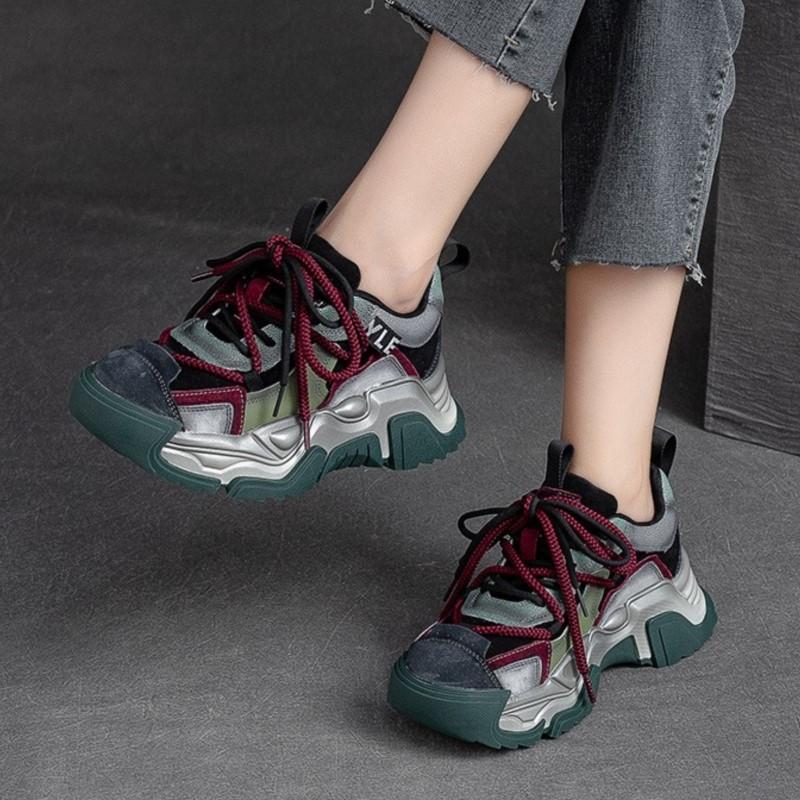 Johnature Casual Flat Shoes Women Sneakers Genuine Leather Mixed Colors Retro Comfortable Thick Sole Platform Sneakers