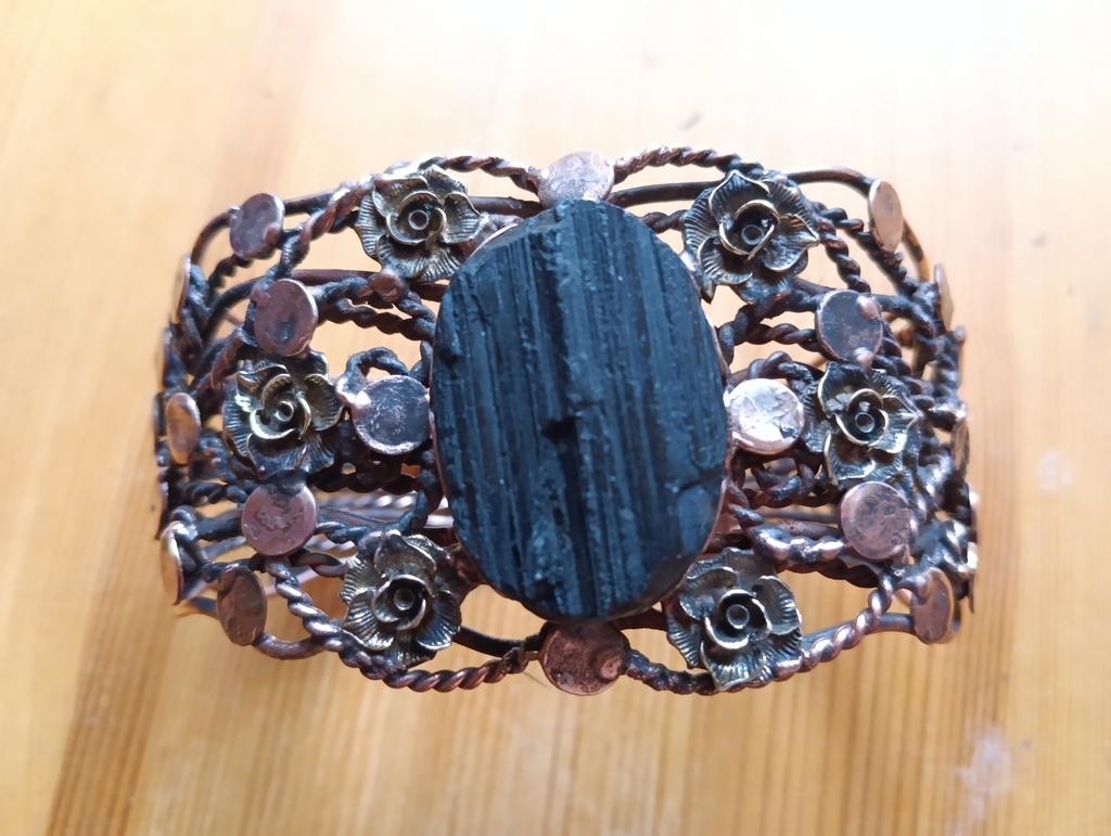 Beautiful Black Tourmaline Rough Gemstone Pure Copper Wire Wrapped Handmade Cuff/Bangle Jewelry