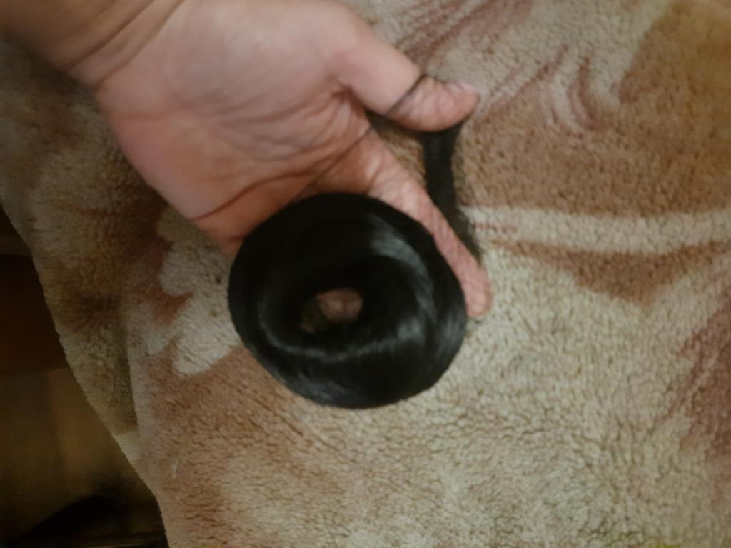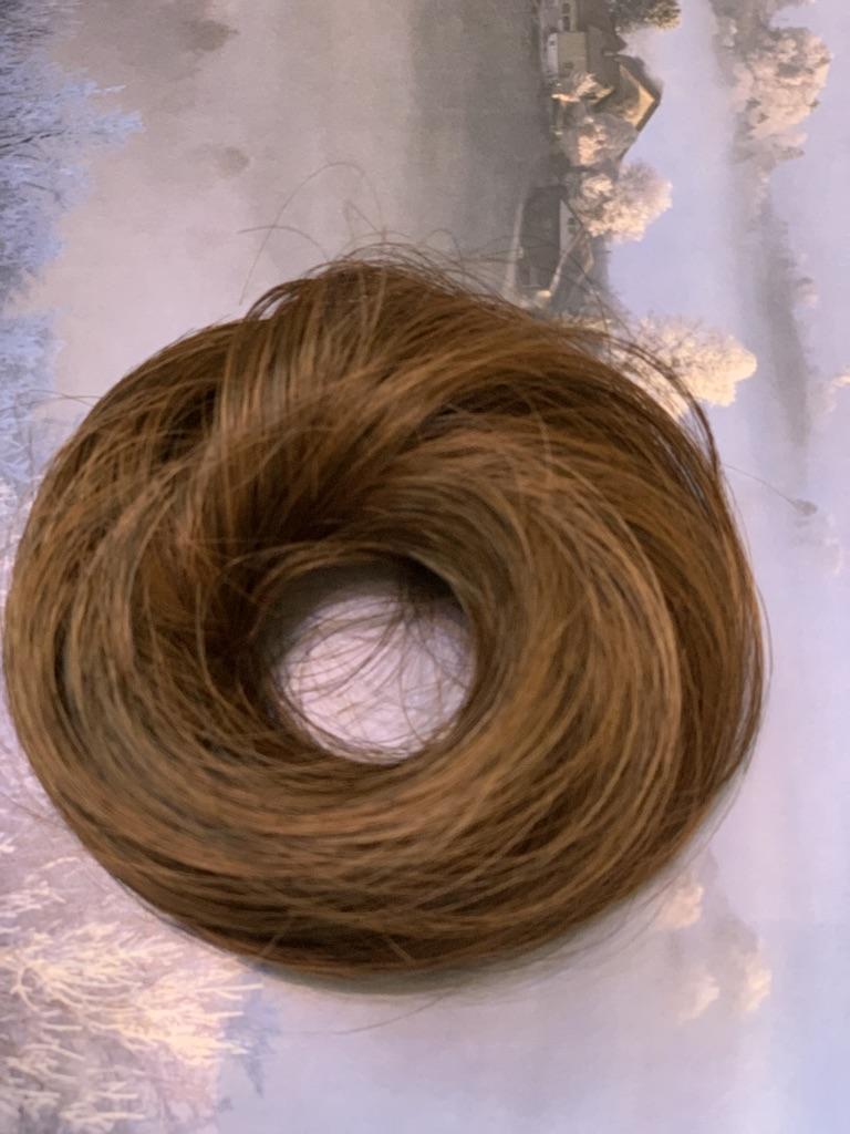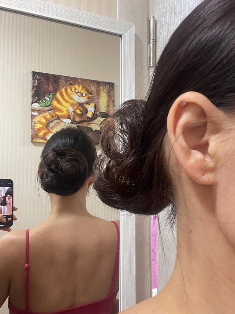 Color - light brown with red (#2 in the seller's photo) This bun is like an add-on for extra volume for a bun on short hair. I have shoulder-length hair. I collect the tail, twist a very dense bundle of my hair with a thin rubber band. I put this bundle on top in one turn and smooth it for a long time, comb the strands, moving my fingers in a circle. I fix it with a hairpin - it turns out a normal volume of bundles in a relaxed, informal style.