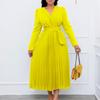 Large Size Women Fashion Solid V Neck Long Sleeves Dress Ladies Elegant One Piece Lace Up Slim Pleated Dress
