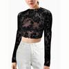 Women Summer Long Sleeve O Neck Black Mesh Perspective Bare Midriff Top T Shirt