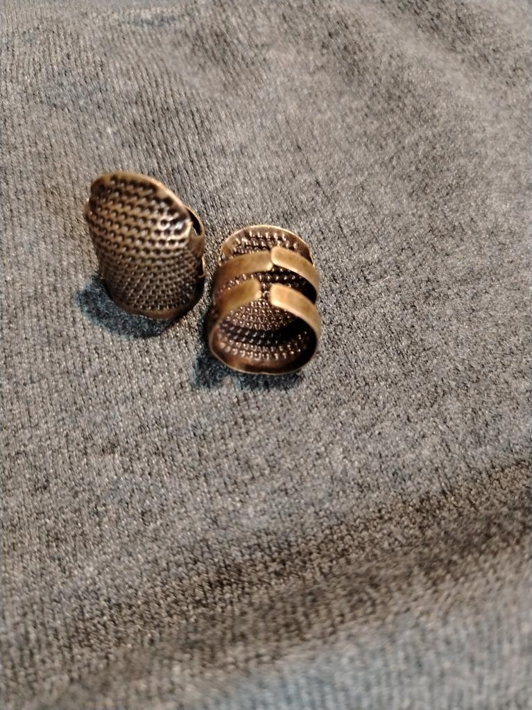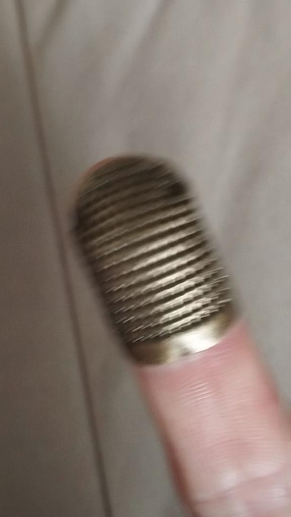Made of some thin metal and the size of a child's finger, it only fit on my little finger. A pitiful imitation of our thimbles.