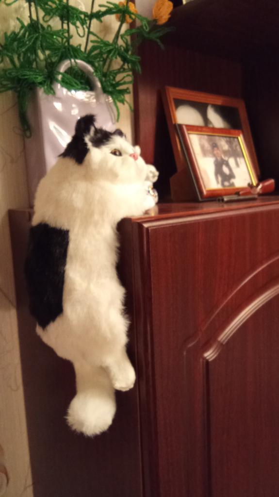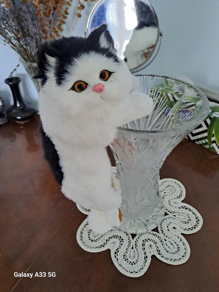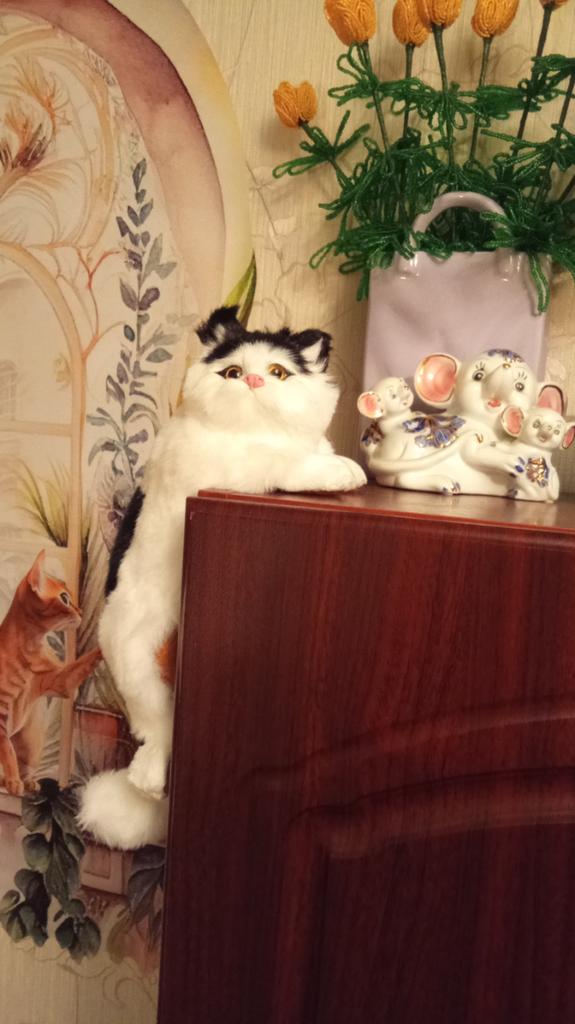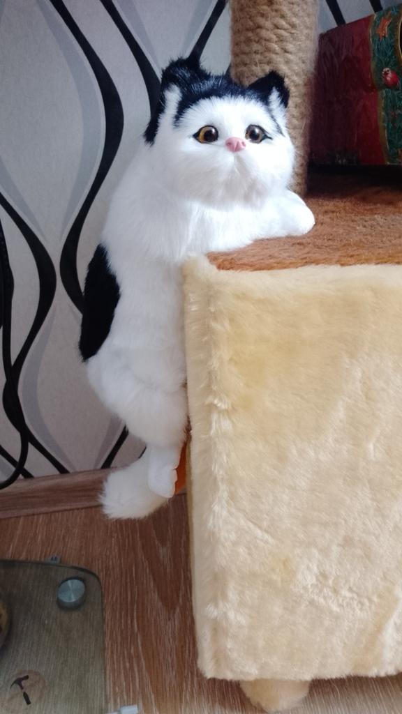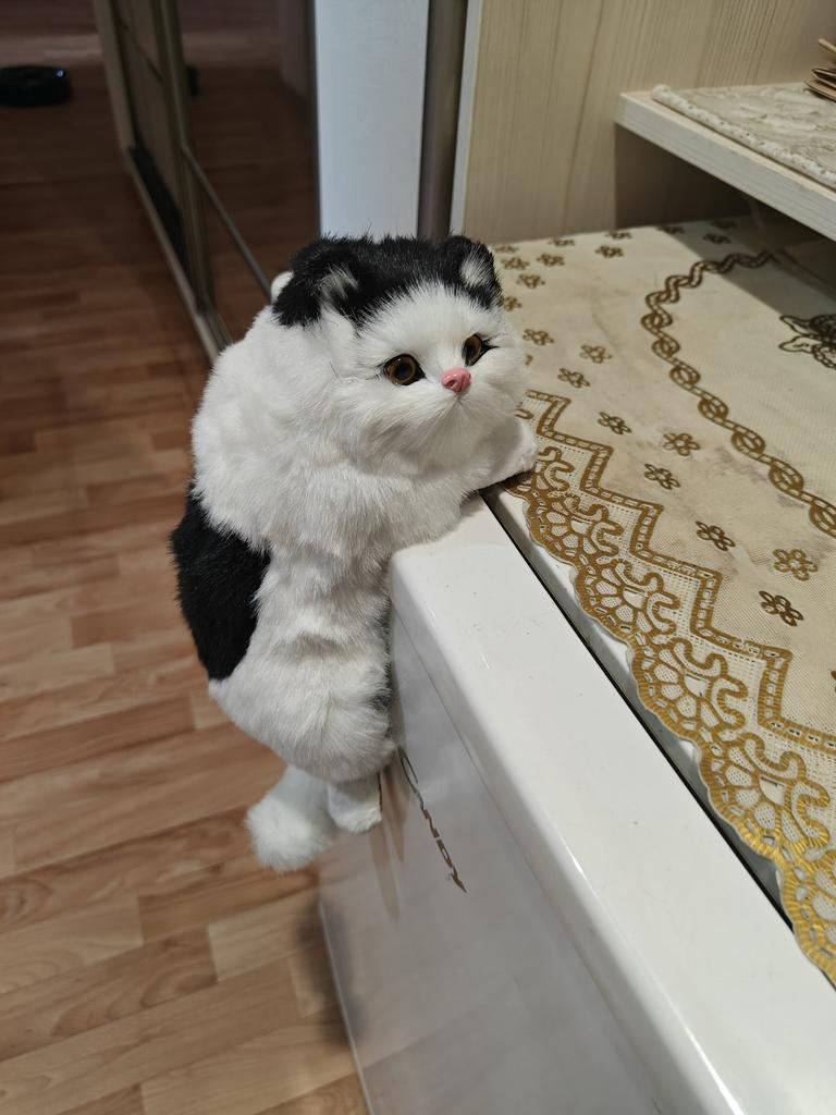 A cute little cat, soft, smooth fur - in reality exactly the same as in the photo. Stays on the shelf well.