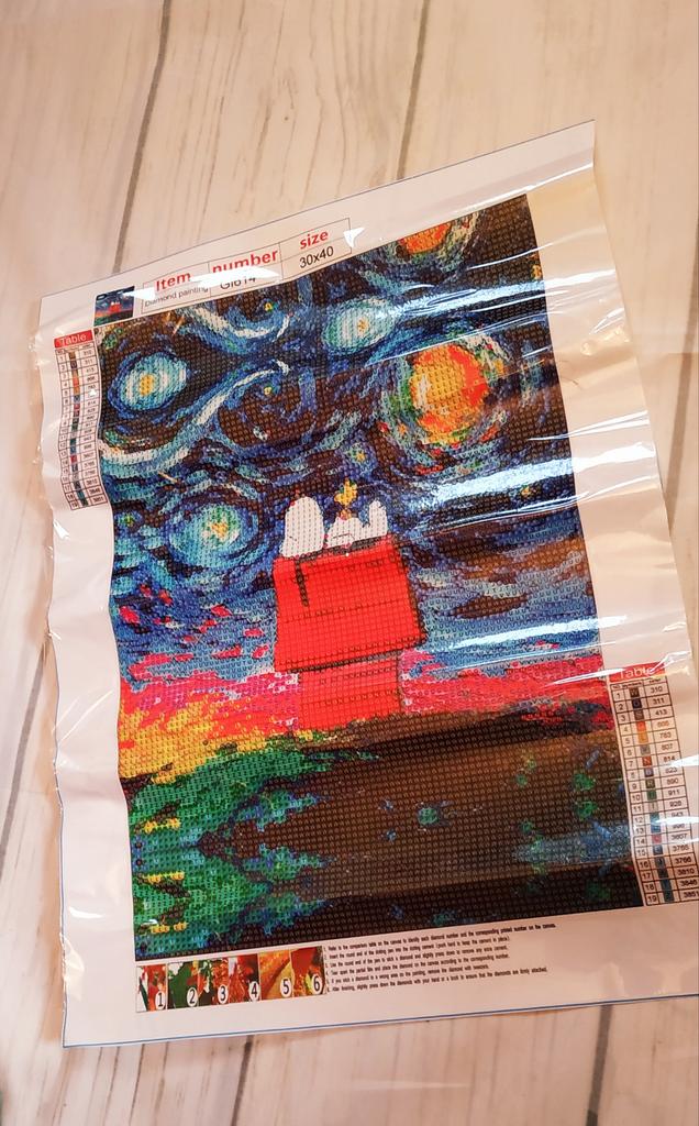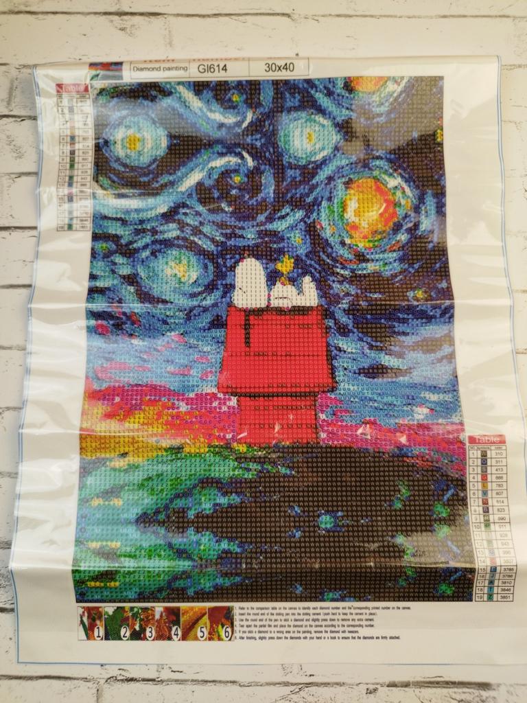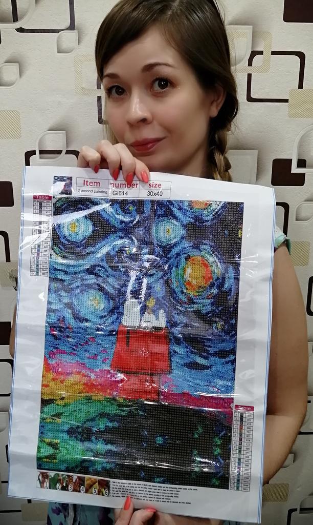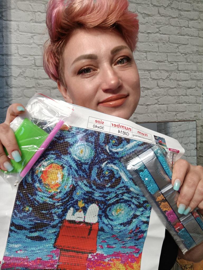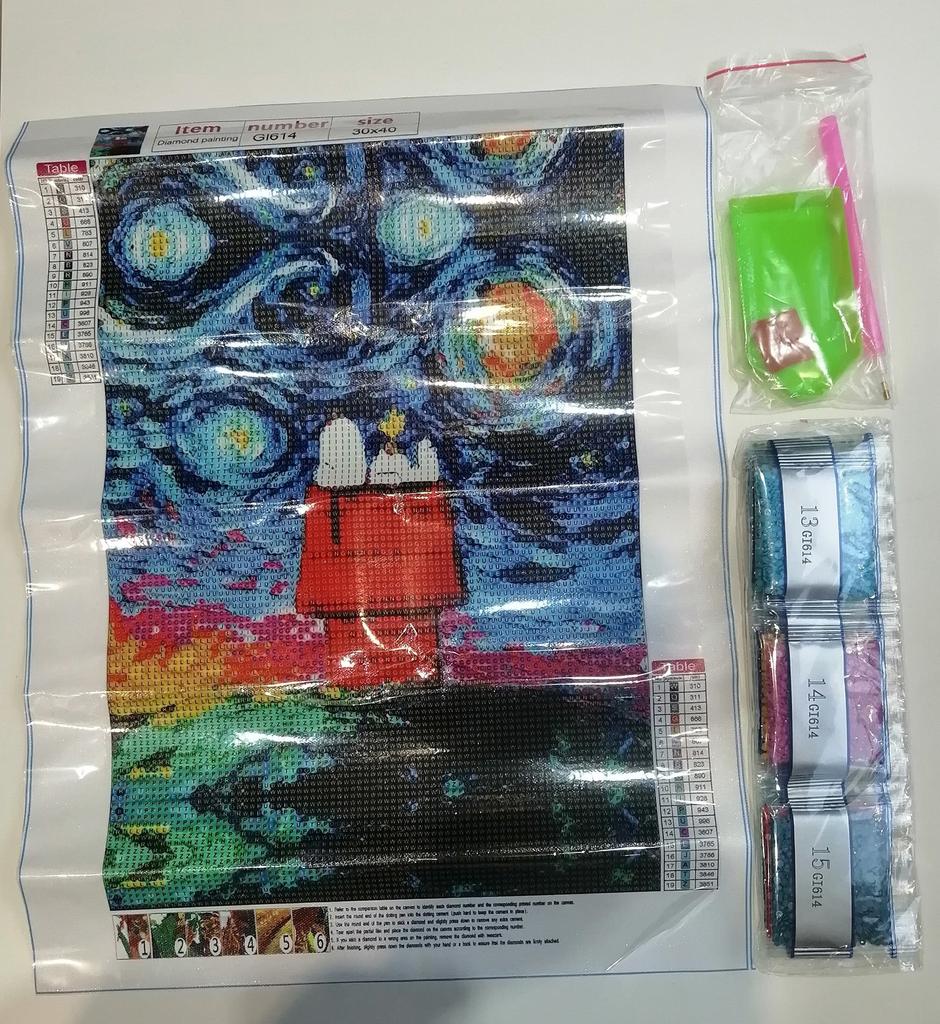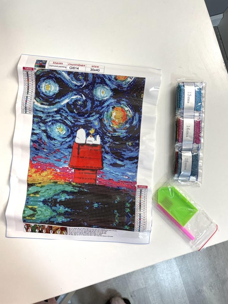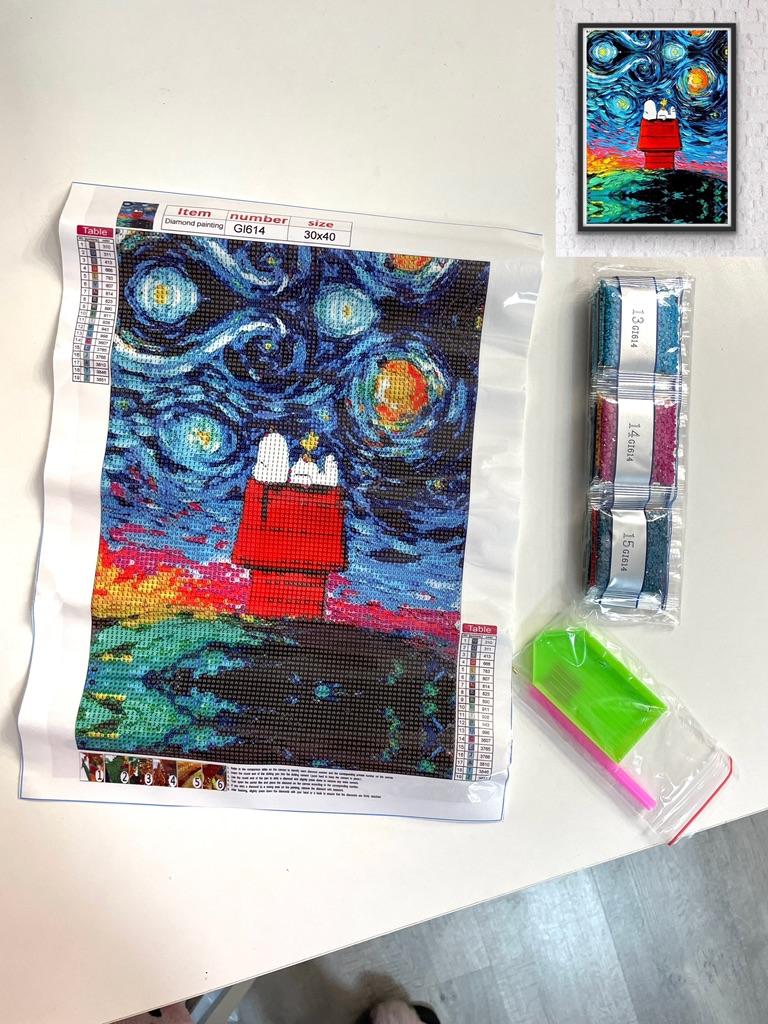 Diamond mosaic. Size 30*40 The painting is inspired by the works of Van Gogh and the cartoon about Snoopy the dog. An interesting combination ☺️ Probably this mix was the main reason for choosing this particular picture for creativity. I also decided to join the cohort of diamond mosaic lovers. The set includes: 💙 Canvas is an adhesive base-canvas on which we will lay out our rhinestones. The canvas is protected by a transparent film, which I advise you to remove gradually during the process of laying rhinestones 💎. 💙 Numbered bags with colored rhinestones. 💙 Plastic tray for rhinestones. 💙 Stylus. (Pencil with which we capture the rhinestones and transfer them to the canvas). 💙 Glue. A flat square piece of substance with which we fill the tip of our stylus. Before starting work, it is advisable to straighten and level the canvas. If the information was useful, put it as a favorite ❤️😘 I received the goods in 38 days in a combined package 🚚 The track was tracked completely. The arrival at the point of issue was announced by sms 📲. Packaging: bubble bag and individual packaging. The canvas is twisted into a roll. Everything arrived intact. Goods without defects and defects, without foreign odor. Happy shopping and fast deliveries to everyone 🛍️☺️🚀🌟