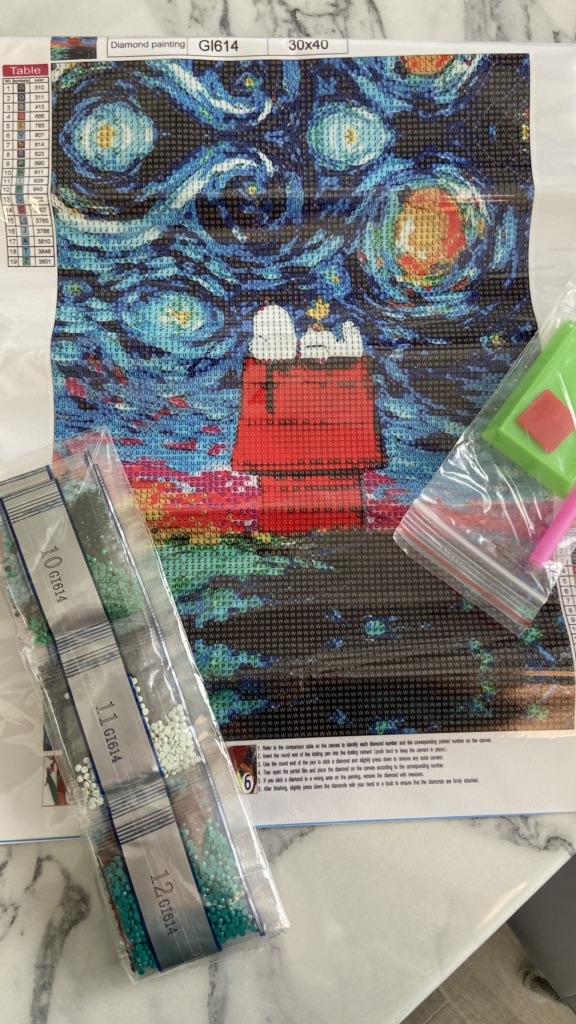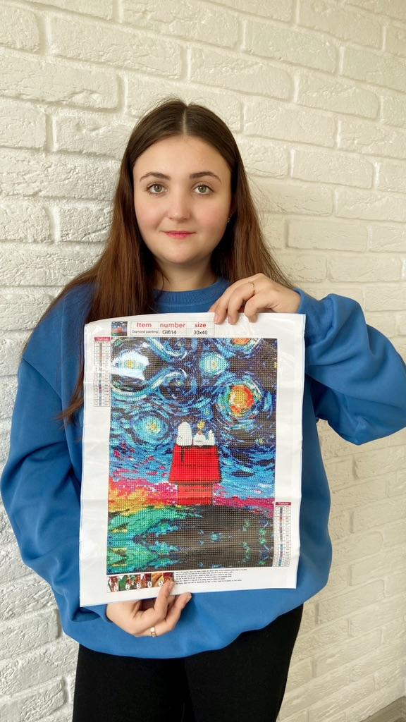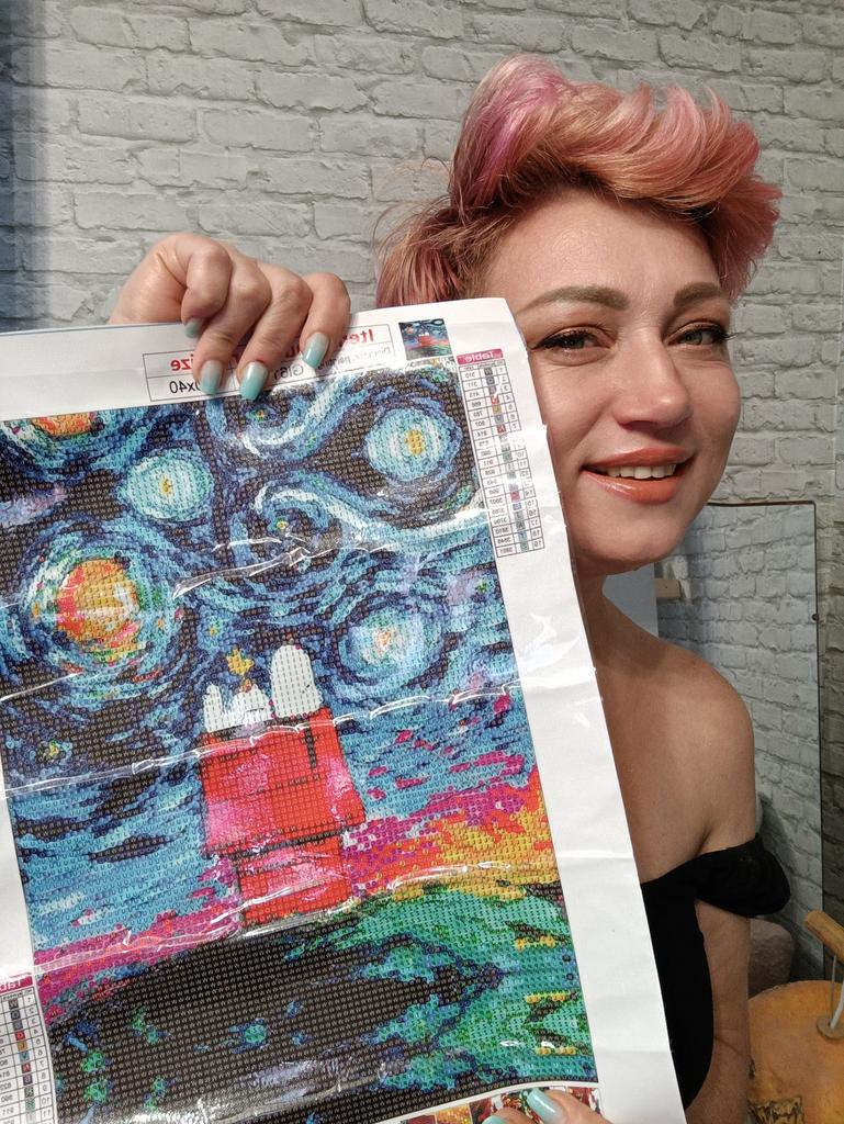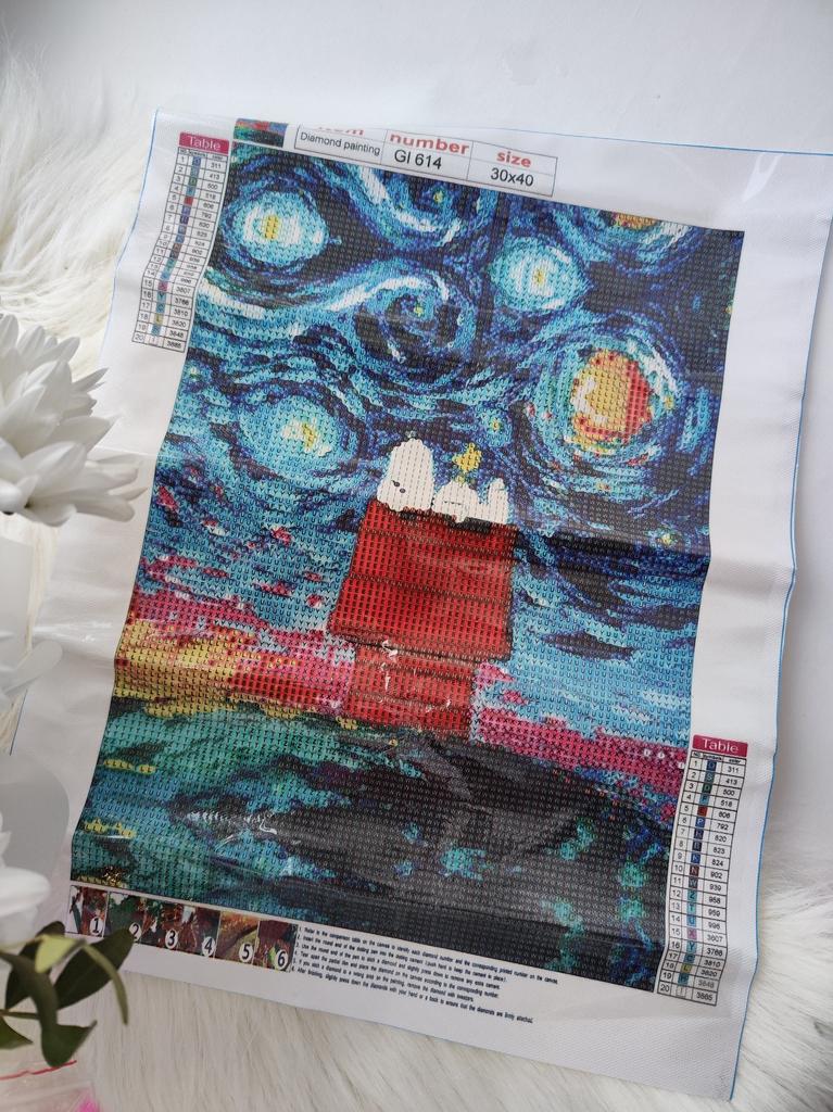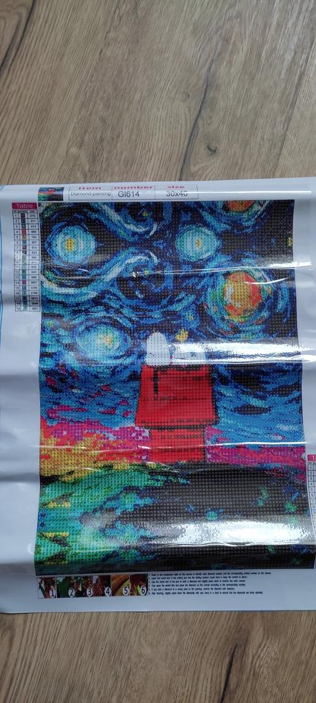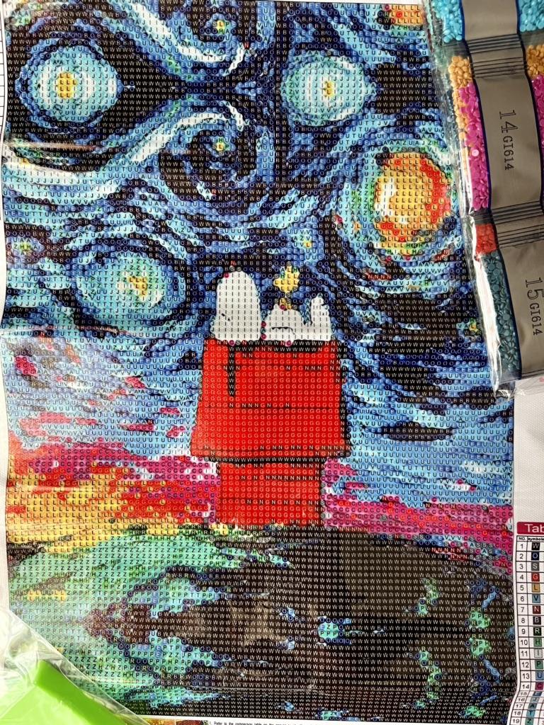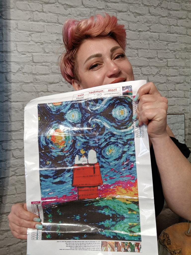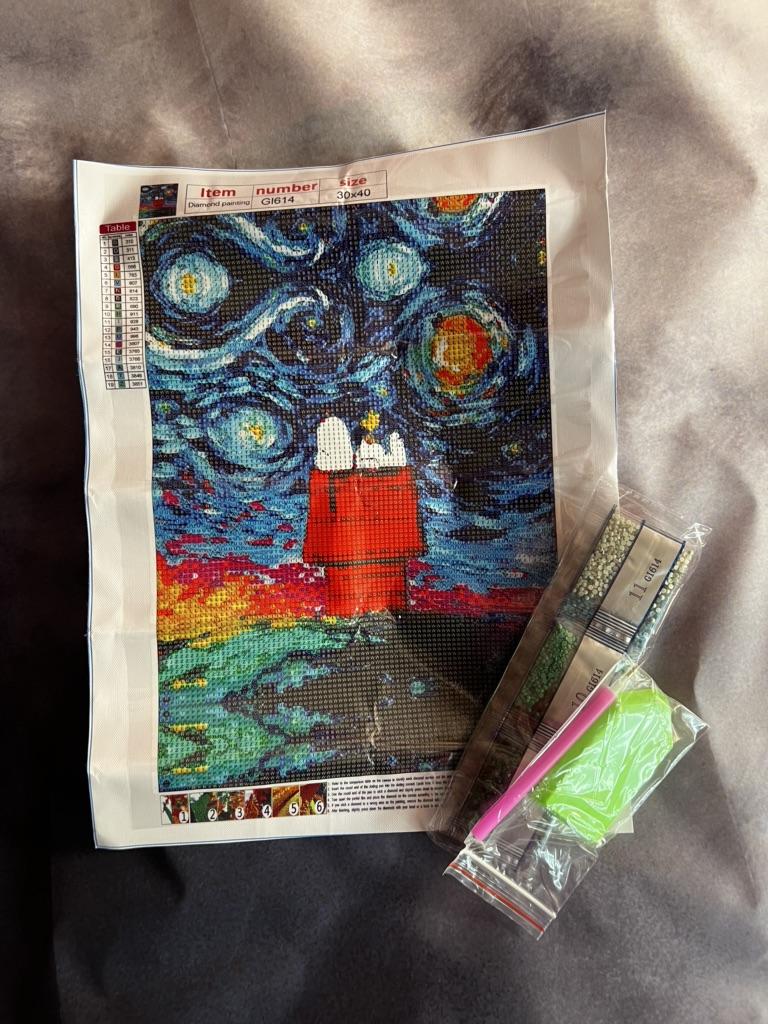Diamond mosaic. Size 30*40 The painting is inspired by the works of Van Gogh and the cartoon about Snoopy the dog. An interesting combination ☺️ Probably this mix was the main reason for choosing this particular picture for creativity. I also decided to join the cohort of diamond mosaic lovers. The set includes: 💙 Canvas is an adhesive base-canvas on which we will lay out our rhinestones. The canvas is protected by a transparent film, which I advise you to remove gradually during the process of laying rhinestones 💎. 💙 Numbered bags with colored rhinestones. 💙 Plastic tray for rhinestones. 💙 Stylus. (Pencil with which we capture the rhinestones and transfer them to the canvas). 💙 Glue. A flat square piece of substance with which we fill the tip of our stylus. Before starting work, it is advisable to straighten and level the canvas. If the information was useful, put it as a favorite ❤️😘 I received the goods in 38 days in a combined package 🚚 The track was tracked completely. The arrival at the point of issue was announced by sms 📲. Packaging: bubble bag and individual packaging. The canvas is twisted into a roll. Everything arrived intact. Goods without defects and defects, without foreign odor. Happy shopping and fast deliveries to everyone 🛍️☺️🚀🌟