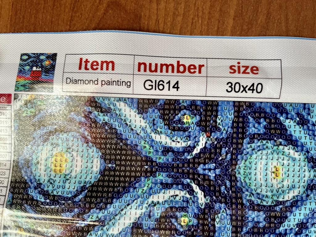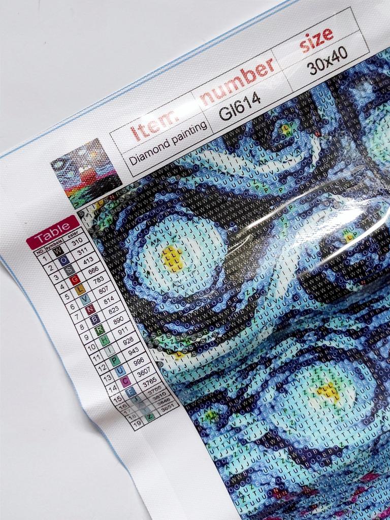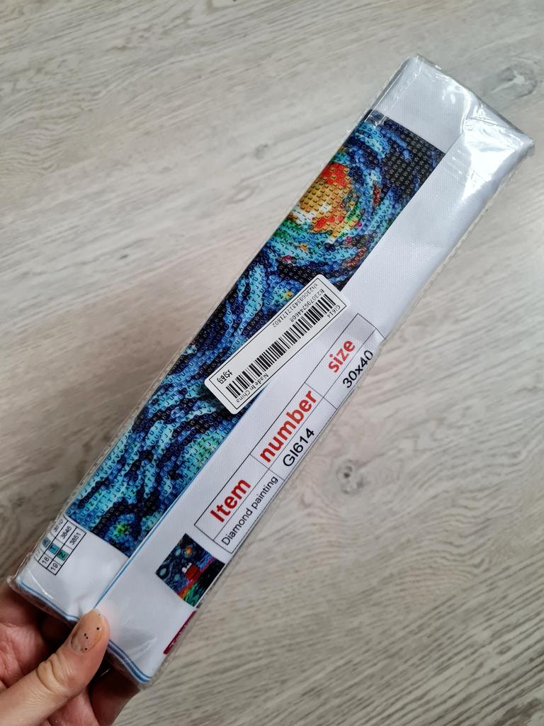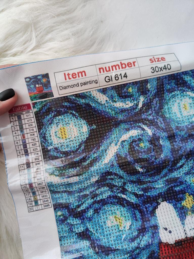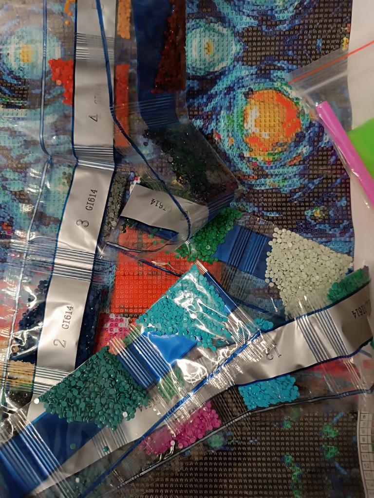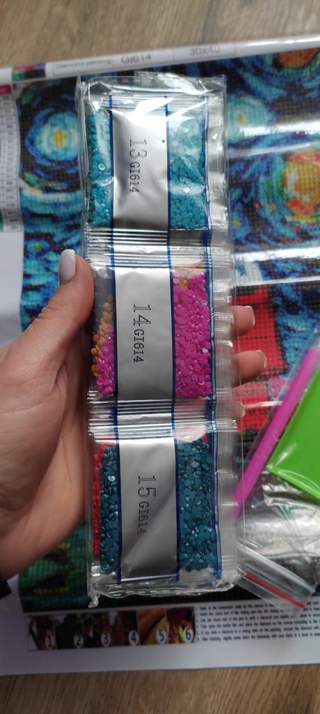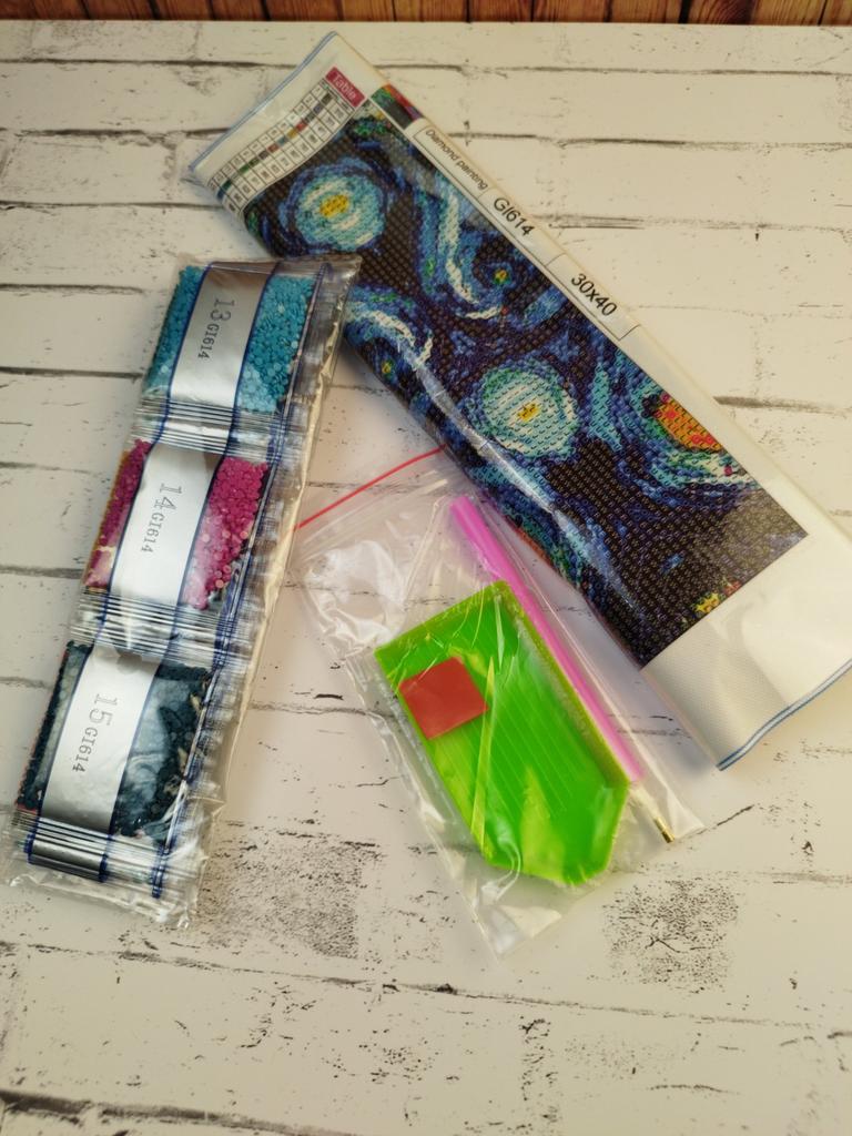 Diamond mosaic. Size 30*40 The painting is inspired by the works of Van Gogh and the cartoon about Snoopy the dog. An interesting combination ☺️ Probably this mix was the main reason for choosing this particular picture for creativity. I also decided to join the cohort of diamond mosaic lovers. The set includes: 💙 Canvas is an adhesive base-canvas on which we will lay out our rhinestones. The canvas is protected by a transparent film, which I advise you to remove gradually during the process of laying rhinestones 💎. 💙 Numbered bags with colored rhinestones. 💙 Plastic tray for rhinestones. 💙 Stylus. (Pencil with which we capture the rhinestones and transfer them to the canvas). 💙 Glue. A flat square piece of substance with which we fill the tip of our stylus. Before starting work, it is advisable to straighten and level the canvas. If the information was useful, put it as a favorite ❤️😘 I received the goods in 38 days in a combined package 🚚 The track was tracked completely. The arrival at the point of issue was announced by sms 📲. Packaging: bubble bag and individual packaging. The canvas is twisted into a roll. Everything arrived intact. Goods without defects and defects, without foreign odor. Happy shopping and fast deliveries to everyone 🛍️☺️🚀🌟
