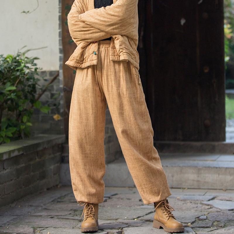 Johnature Women Vintage Linen Bloomers Pants Solid Color Warm Elastic Waist Autumn Winter Losoe Women Warm Pants