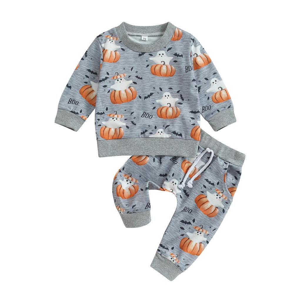 Baby Boys Halloween Clothes Pumpkin Print Long Sleeve Sweatshirt and Elastic Pants 2 Piece Tracksuit for Toddler