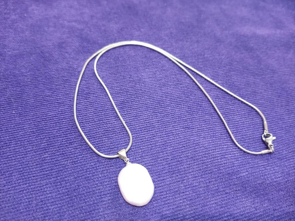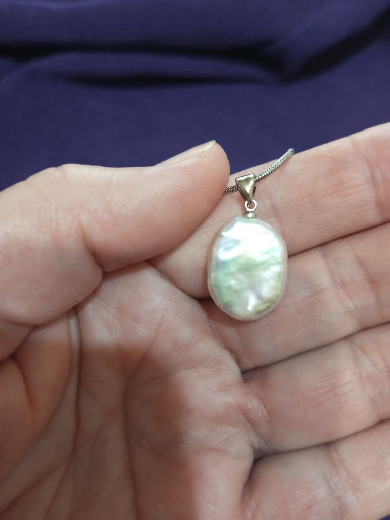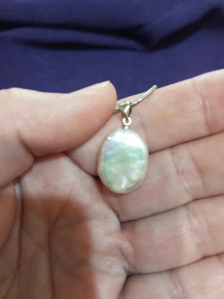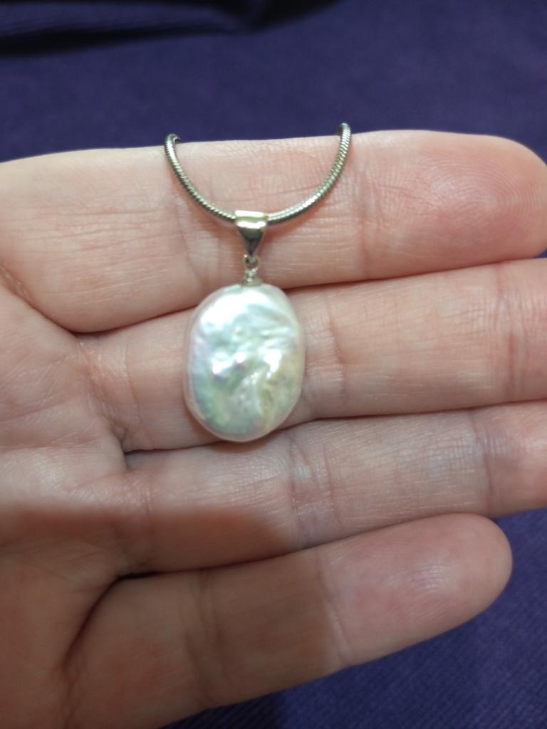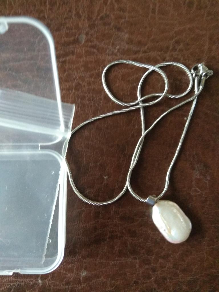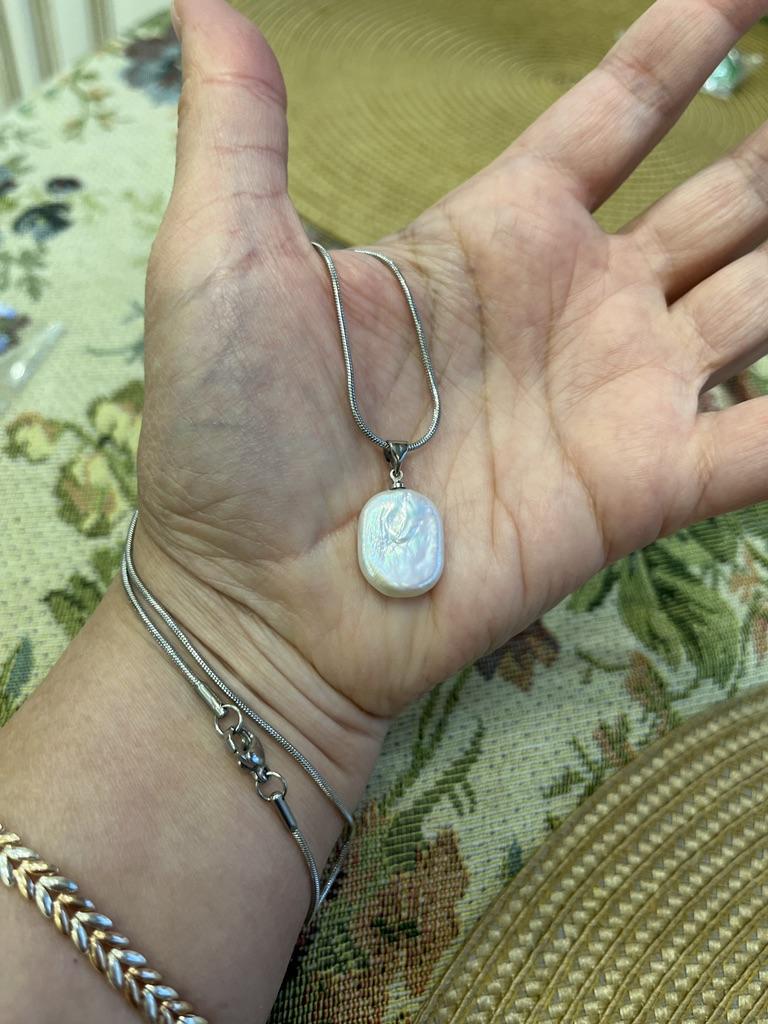 The pendant came in an individual plastic box. The set includes a 40 cm chain, outwardly similar to steel, without samples. The pendant is noticeable in size (about 1×1.5 cm), each side of the pearl has its own texture. The coating looks like natural mother-of-pearl, although I'm no expert. In general, quite a decent thing for little money for every day. Thank you.