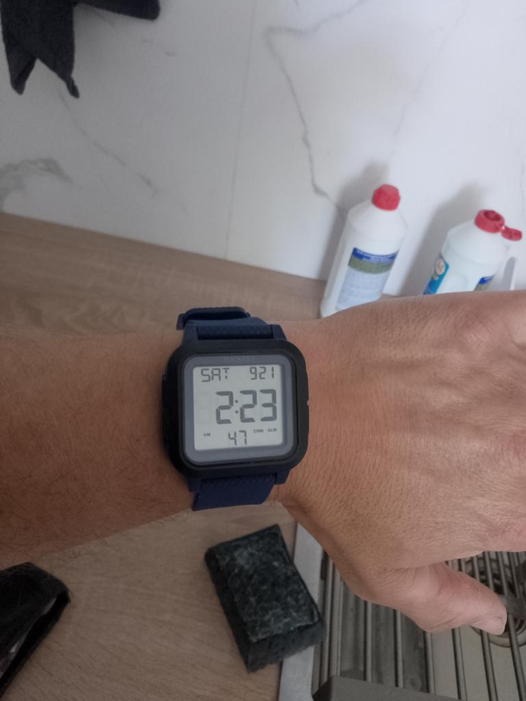 An extraordinarily good watch. Strap in various colors. Clear display, the time in large numerals. Continue with: hour, minutes, seconds, date, month, 12-24 alarm, stopwatch, illumination. Highly recommended. I ordered a few more later. Note that tastes differ.