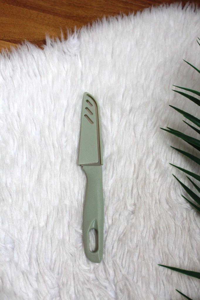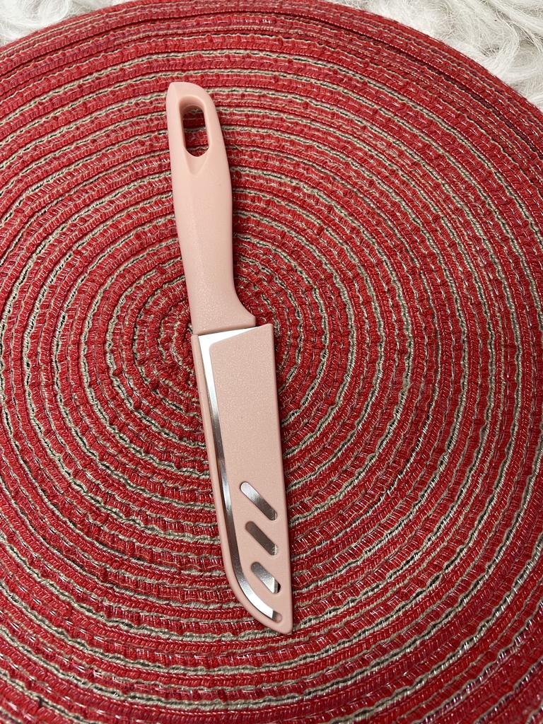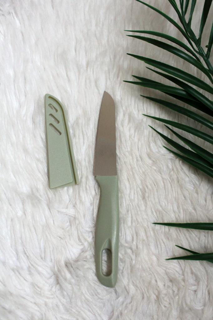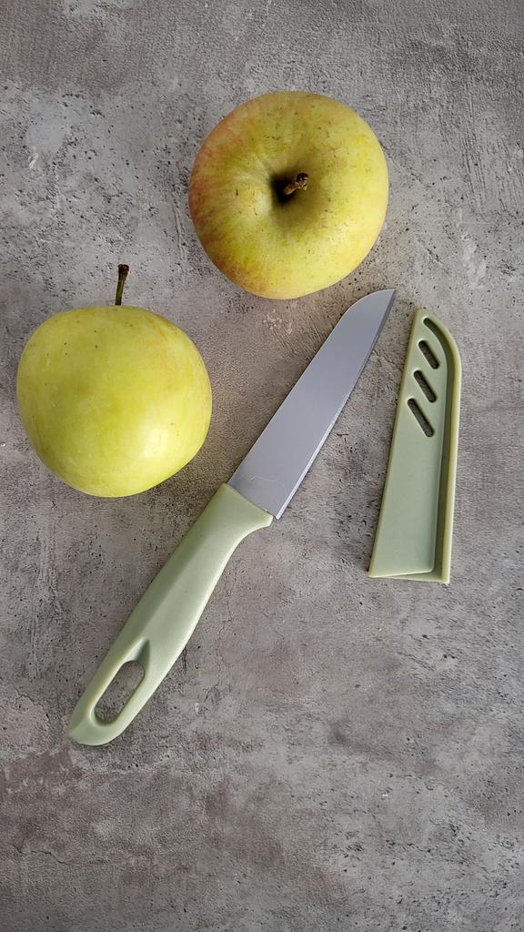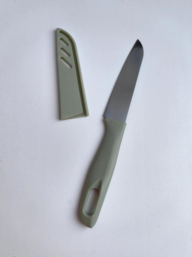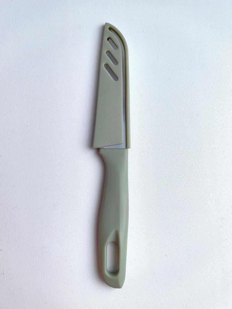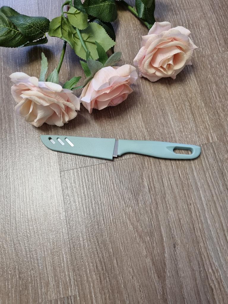 Knife 🍃 Kitchen knife in sheath. Lightweight, convenient, perfect for fruits and bread. The handle and sheath are made of plastic.. Stainless steel blade. Total length 19cm. Blade length 9.7 cm. Handle length 9.3 cm. There is a hole on the handle for hanging. Nice knife, and looks nice.