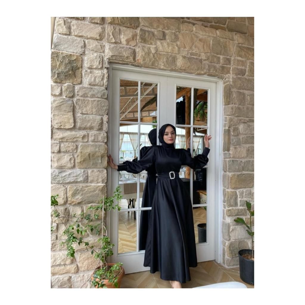 Women's Black Satin Belted Bellae Dress
