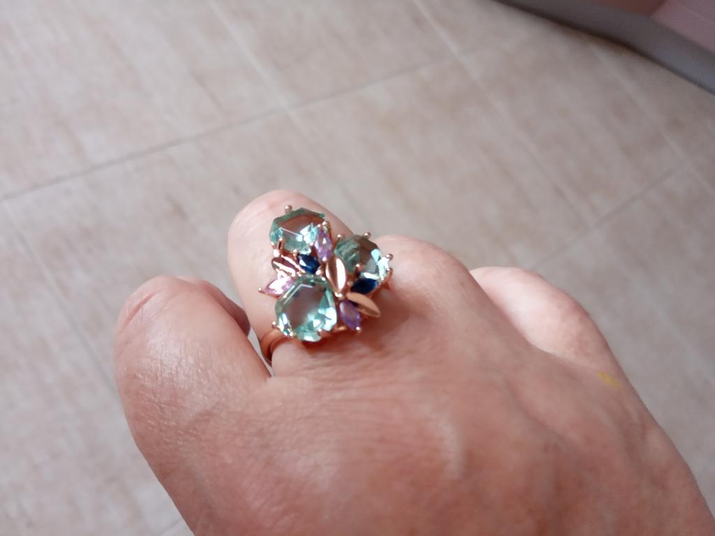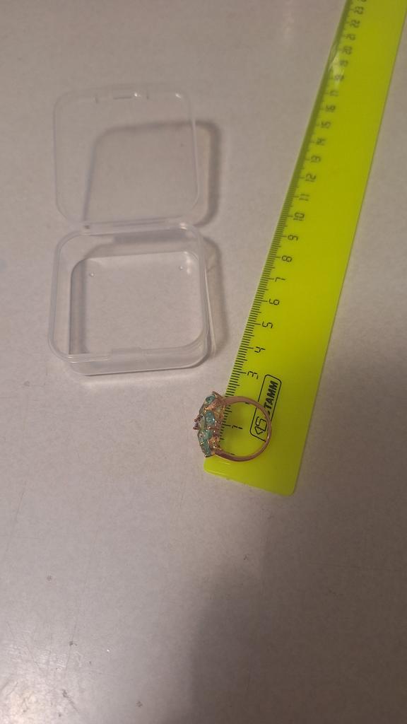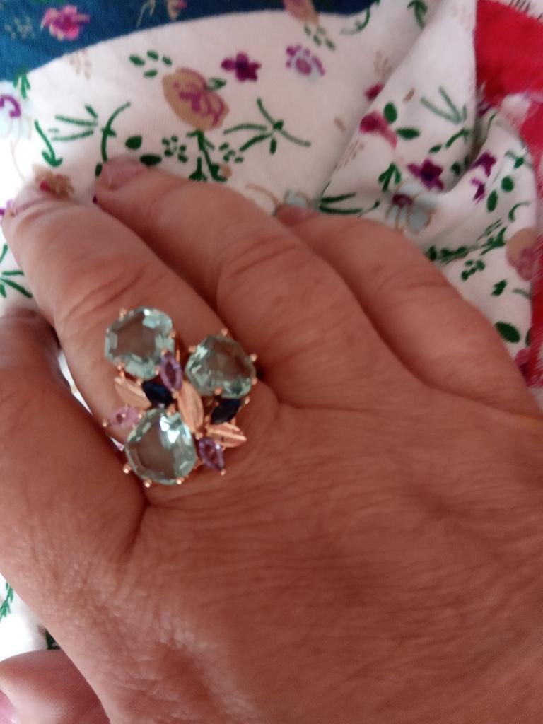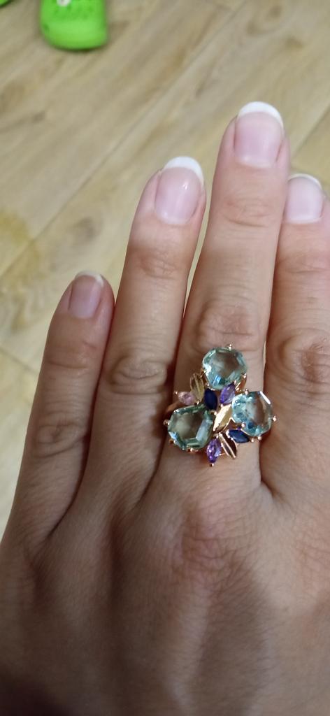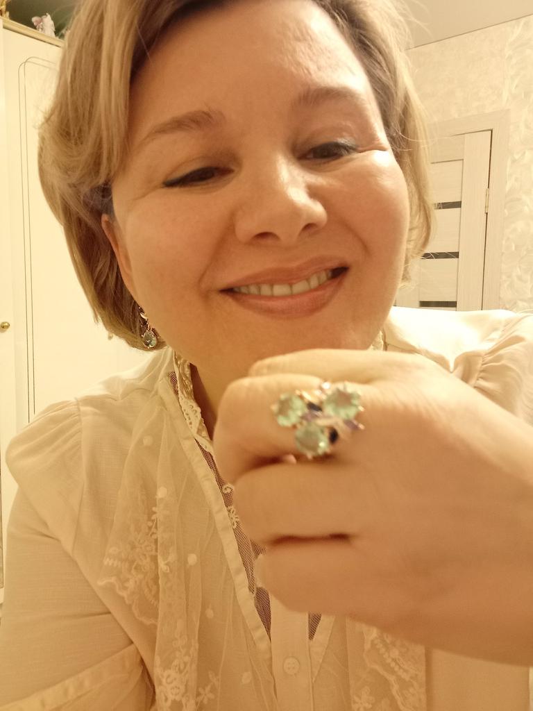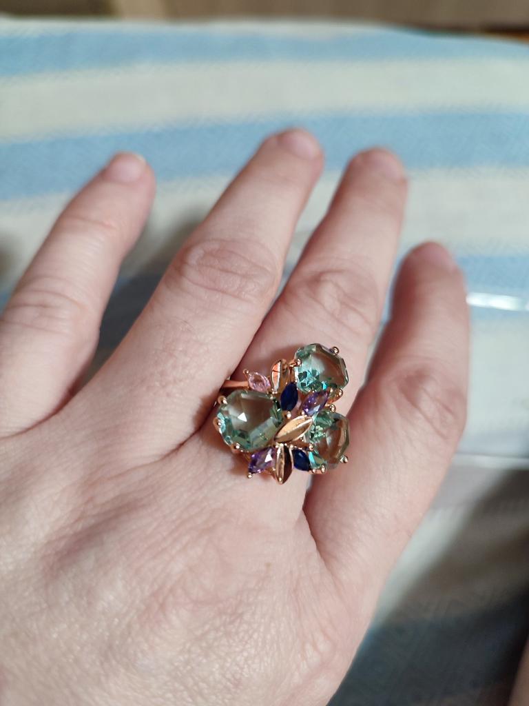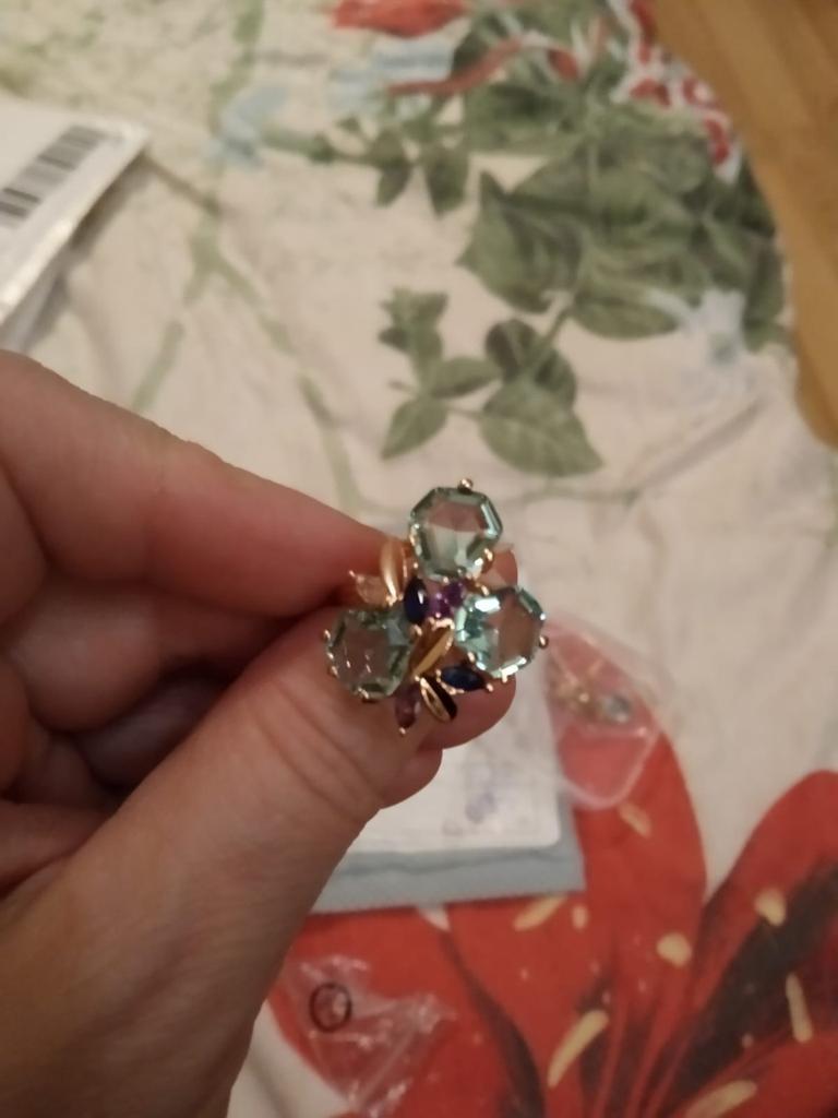The ring is size 8, just right for 18, a bit too big, the stones are more light blue than green, with small inserts-stones of blue and purple color. It looks great on the hand. I wear it with pleasure, I recommend buying it.