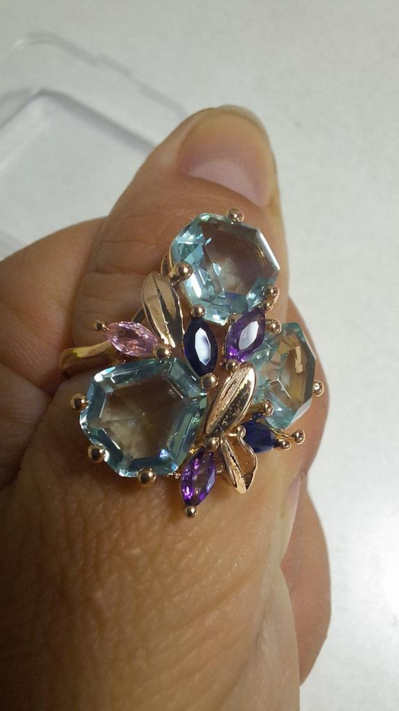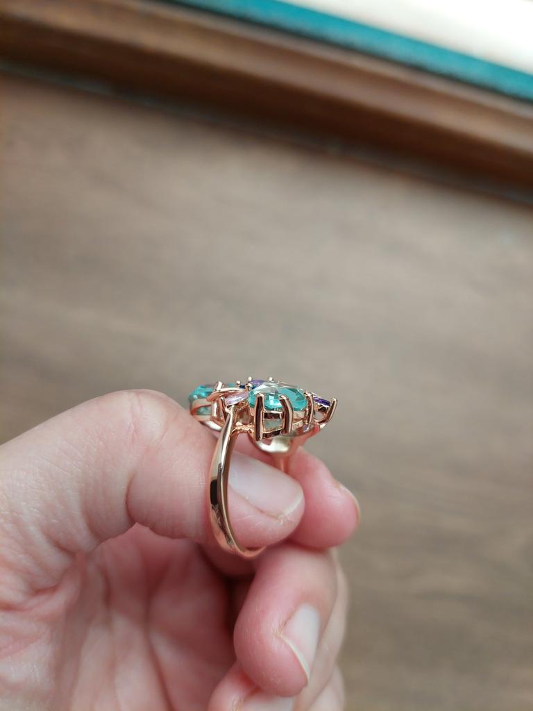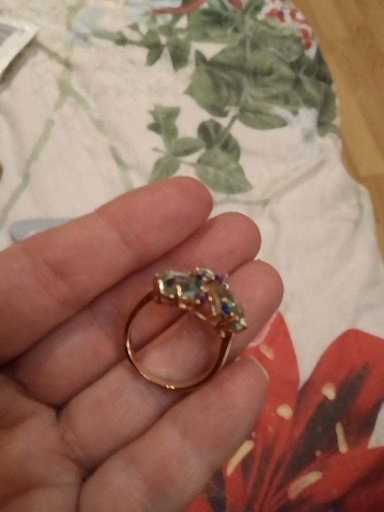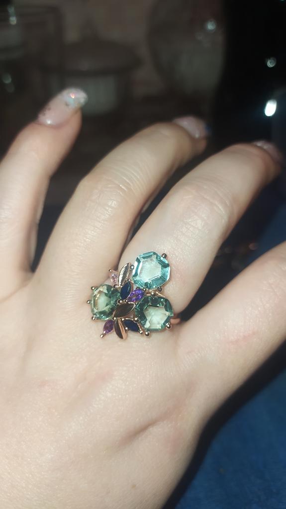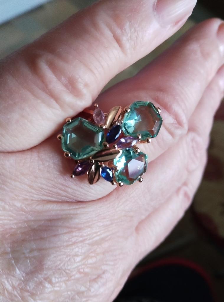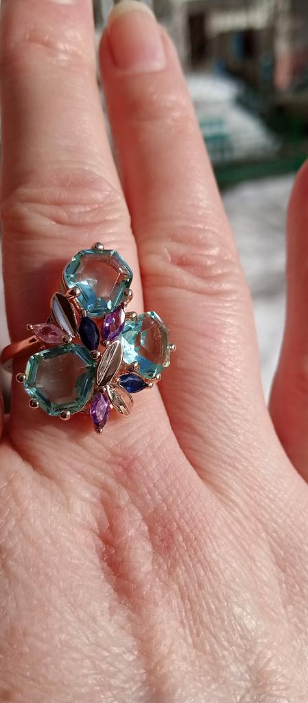 The ring is size 8, just right for 18, a bit too big, the stones are more light blue than green, with small inserts-stones of blue and purple color. It looks great on the hand. I wear it with pleasure, I recommend buying it.