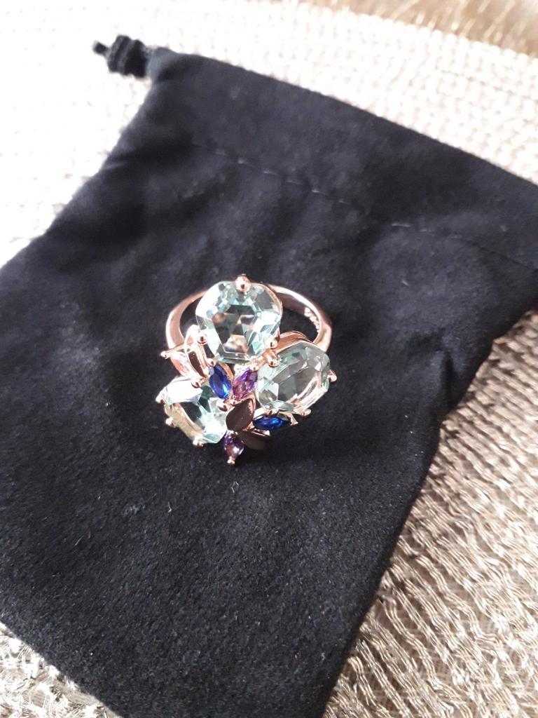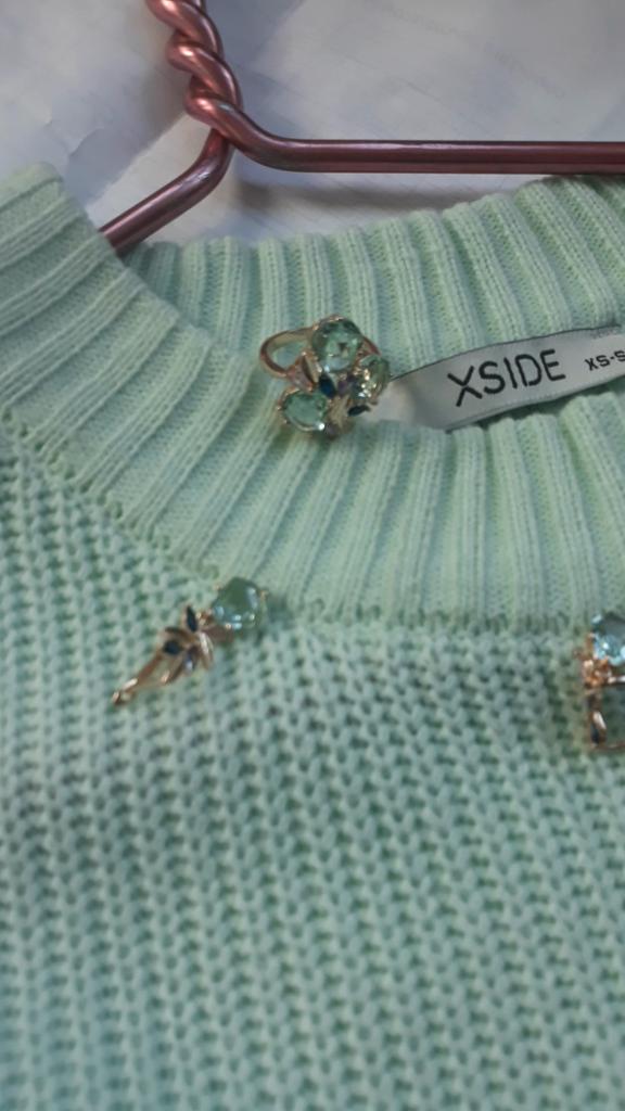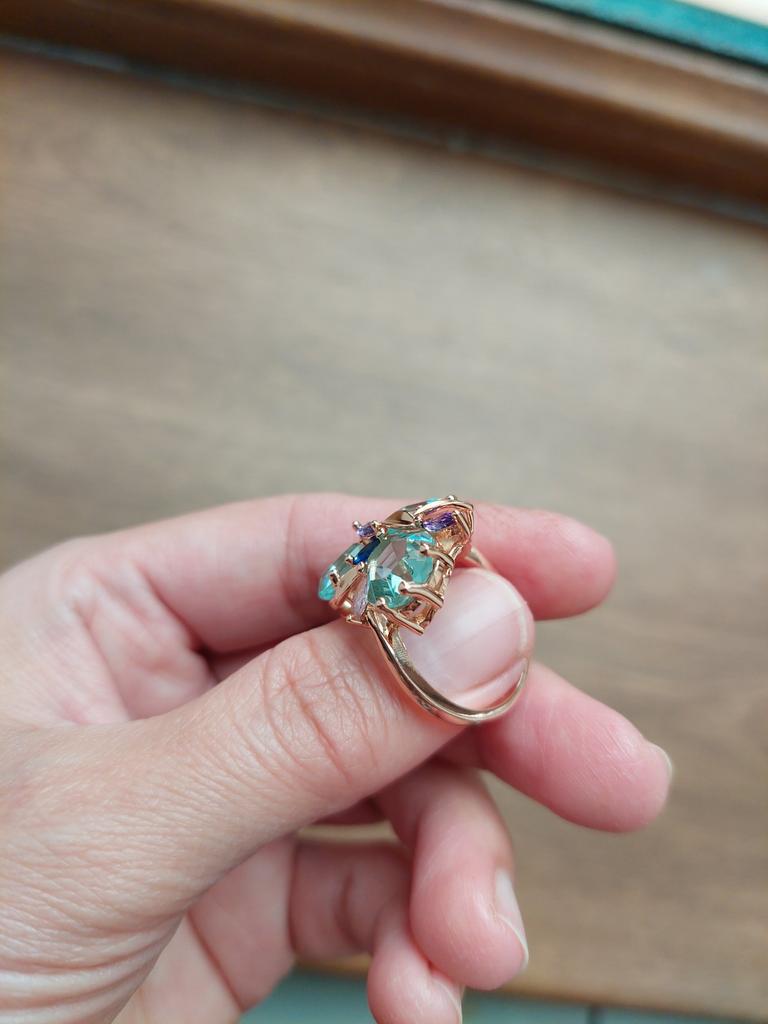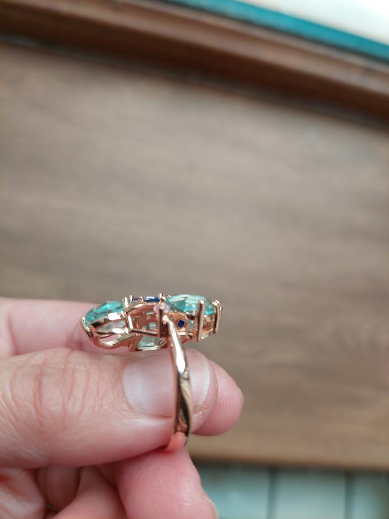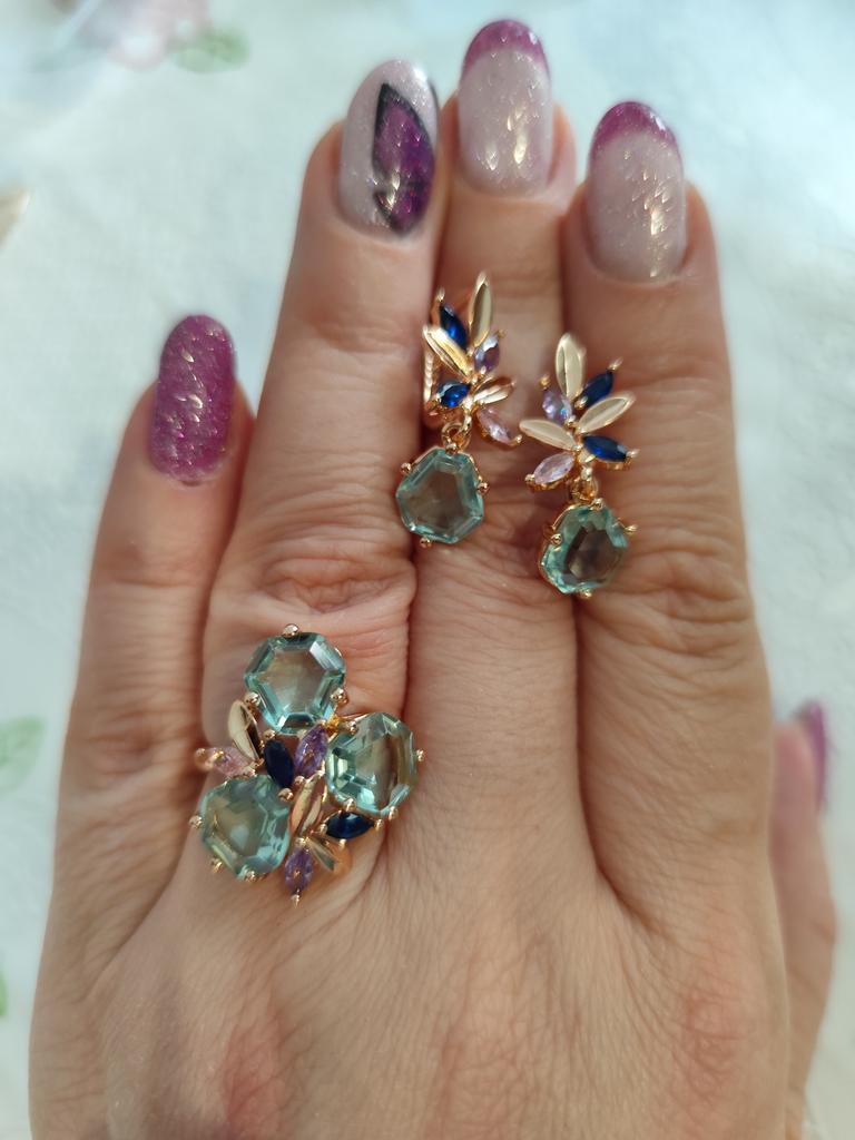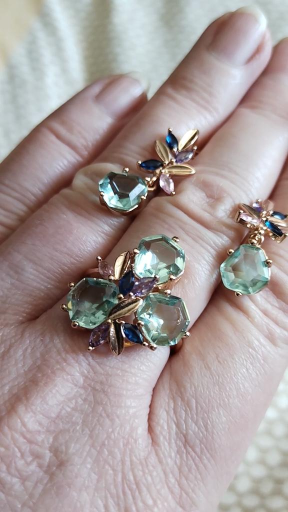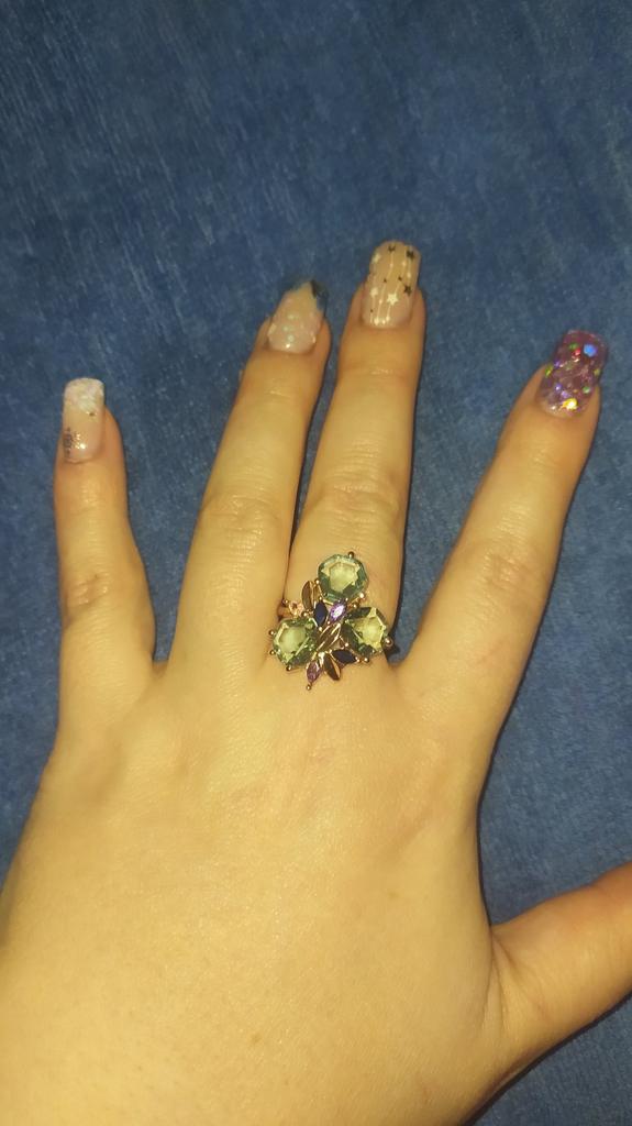 The ring is size 8, just right for 18, a bit too big, the stones are more light blue than green, with small inserts-stones of blue and purple color. It looks great on the hand. I wear it with pleasure, I recommend buying it.