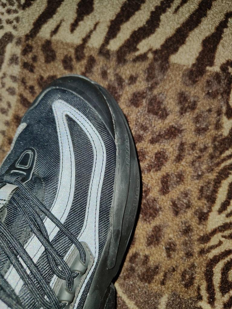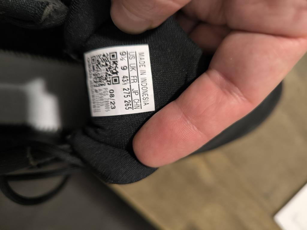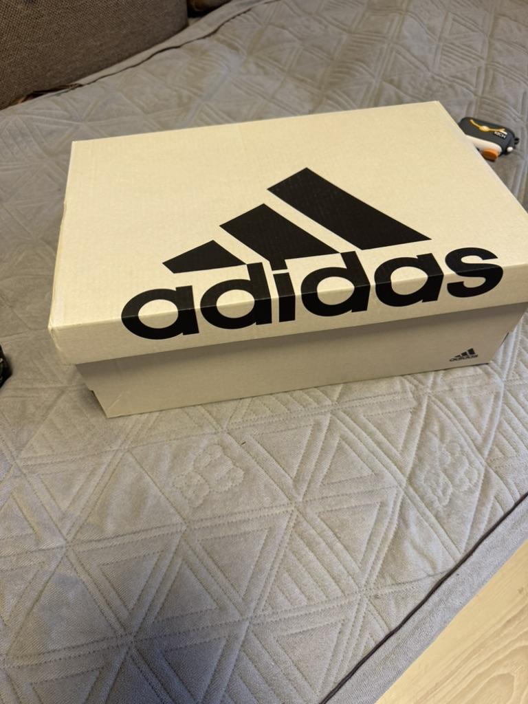 The box was wet and battered. The right sneaker has glue on the outside and is slightly scuffed.