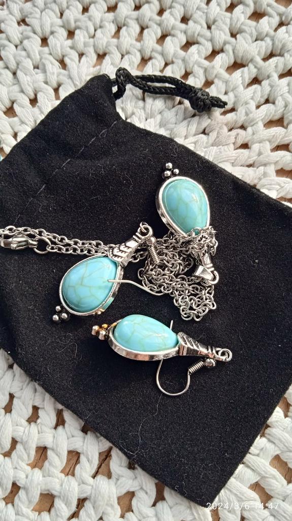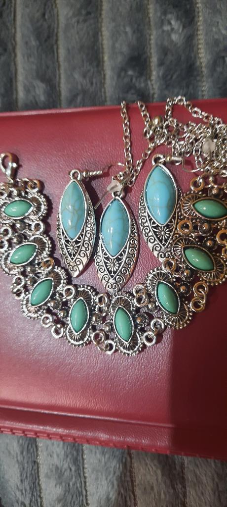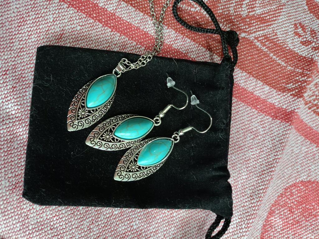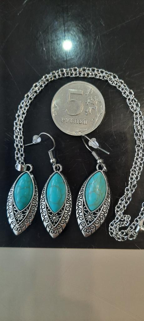 Interesting greenish color of turquoise. The set is not small. The set is elegant.