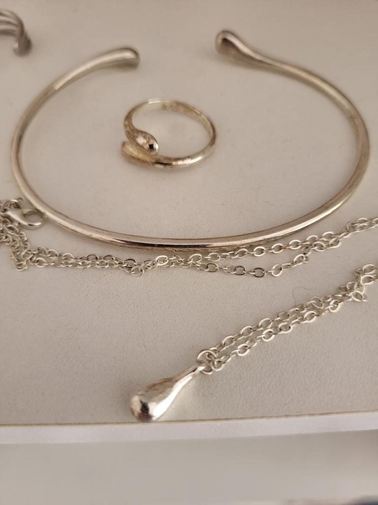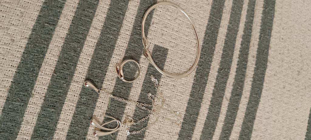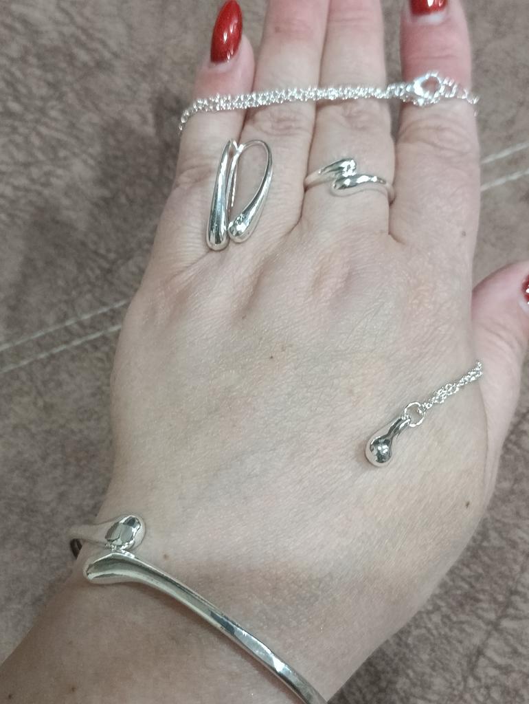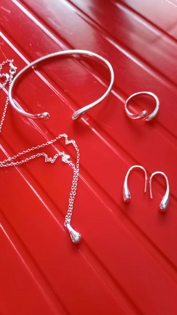 Not at all like in the picture. The pendant is small, very straight, tiny, looks awkward in the set, there are 2 solders on the ring, the bracelet is small.