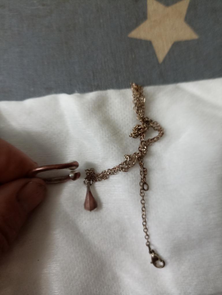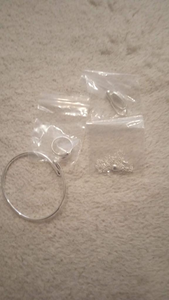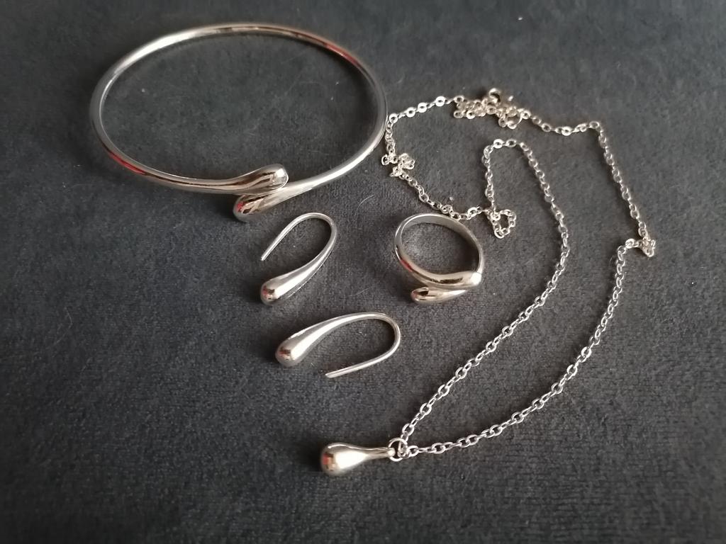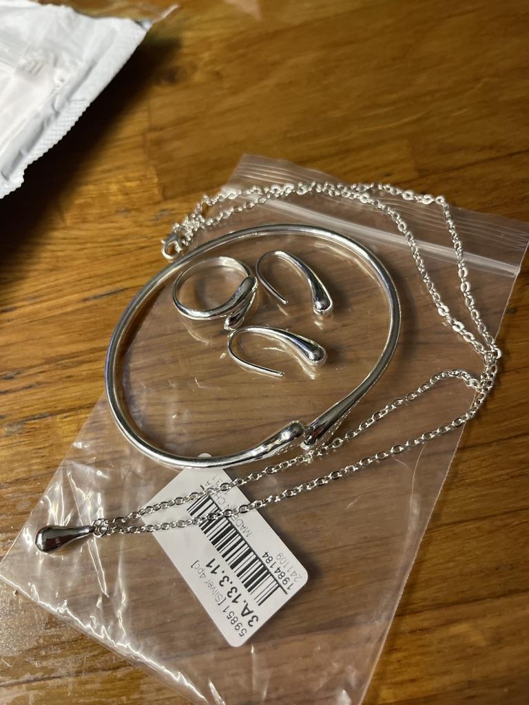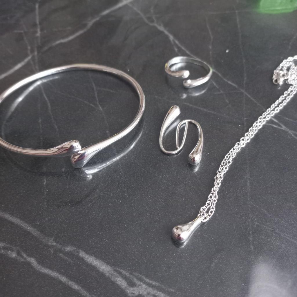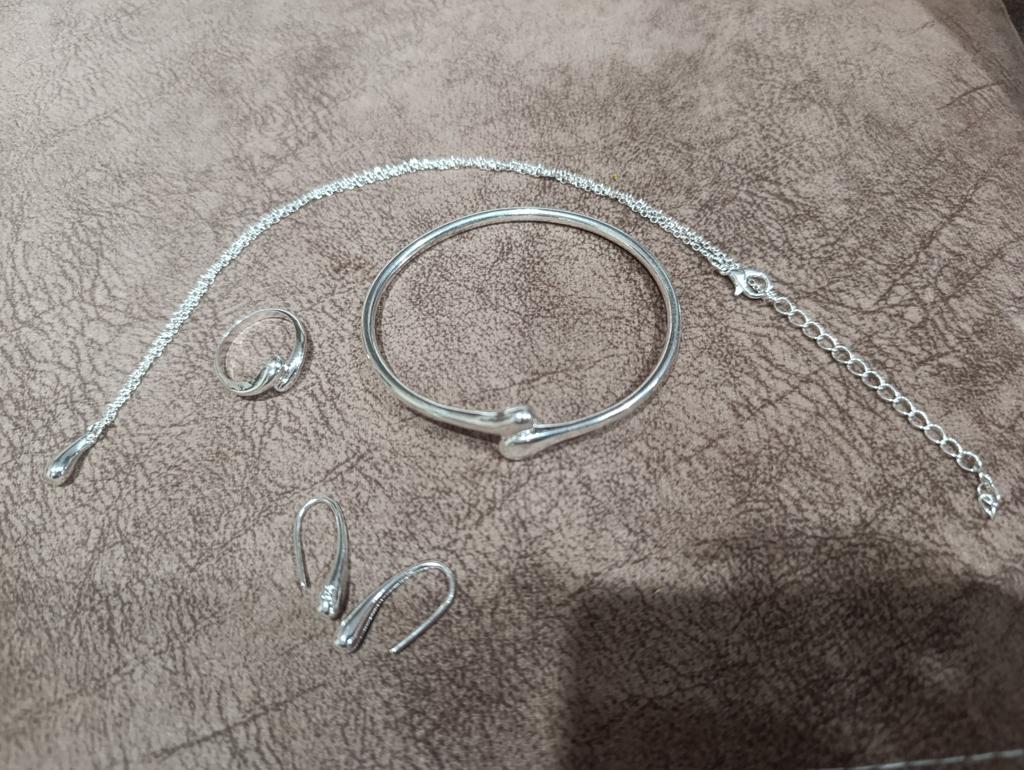 A very decent set. Metal, not empty - heavy. Chain with a beautiful diamond cut. The ring, without extension, is about size 17. The bracelet is also not complete. The quality is good, amazing for such a price.