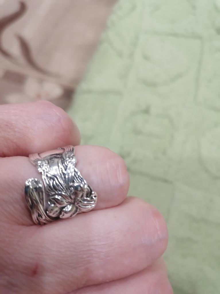 Cool ring, looks stylish on the thumb. But it's not blackened, like in the photo, but just like polished silver.