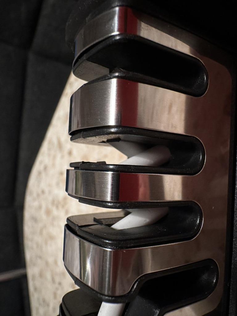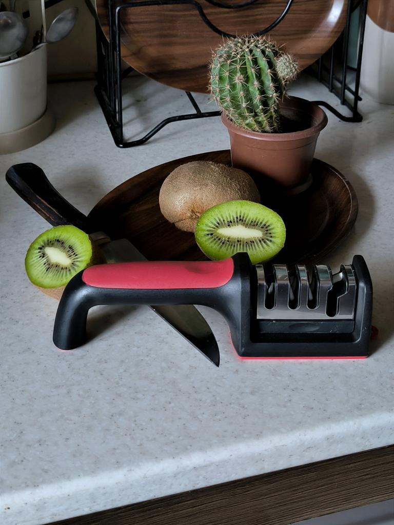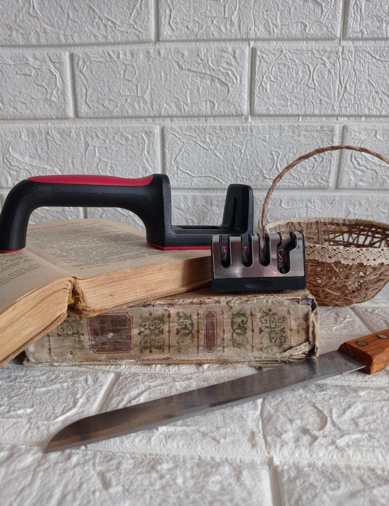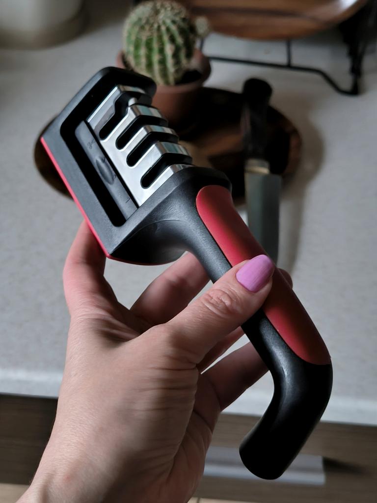 Knife sharpener) Interesting design Made with high quality, not fragile There are three branches Very comfortable Does its job very well