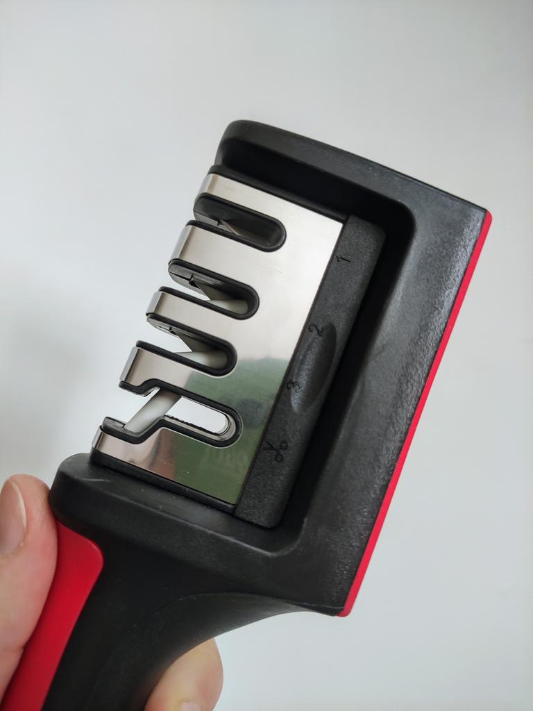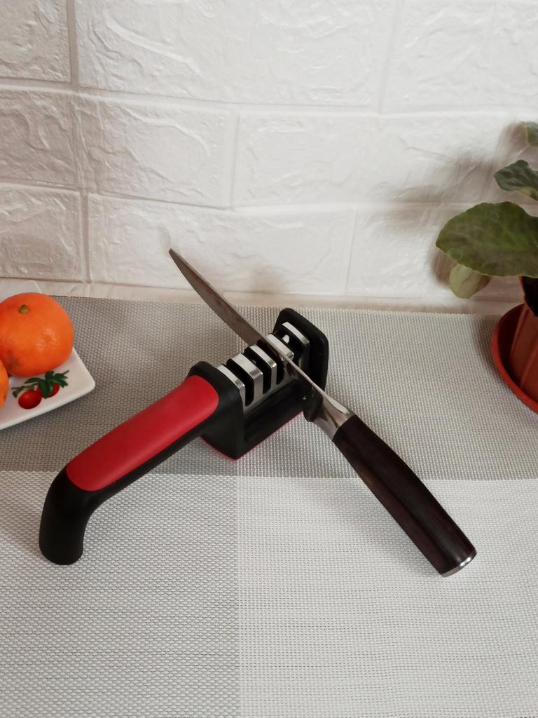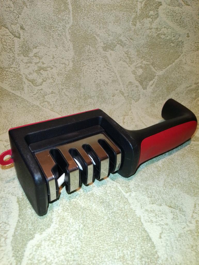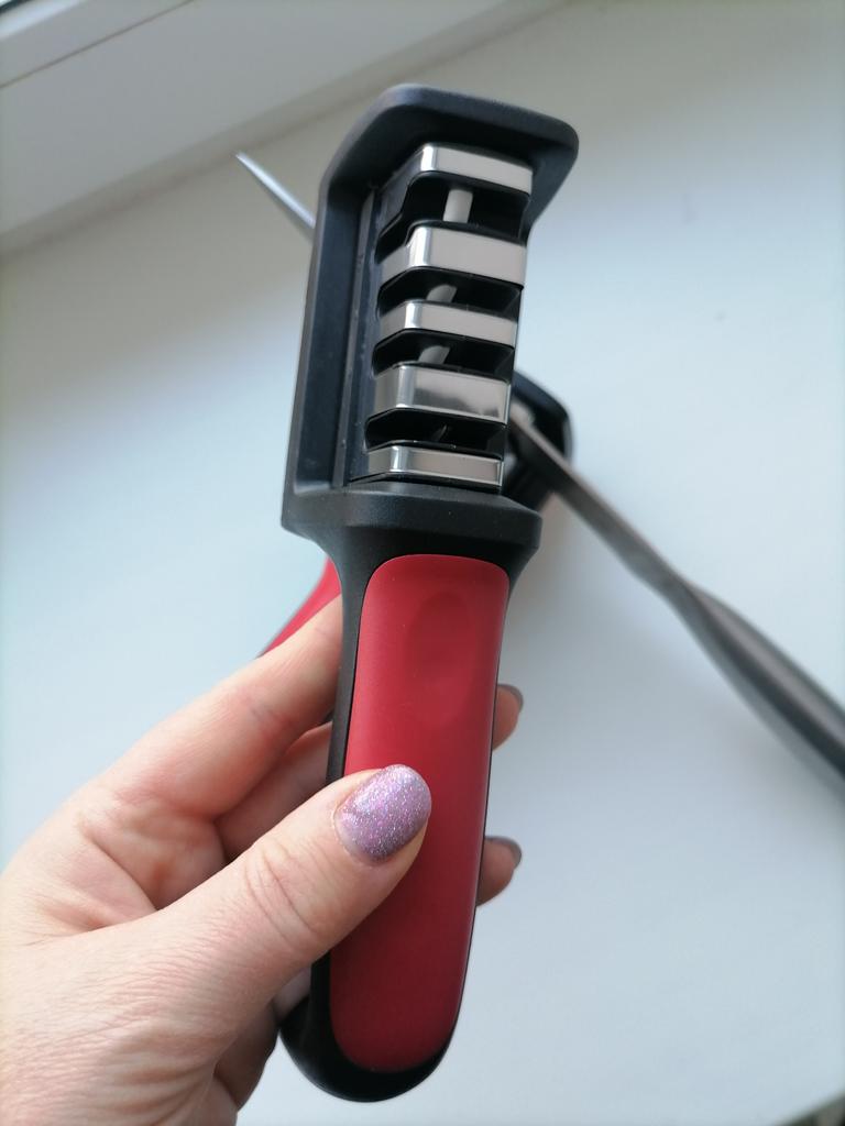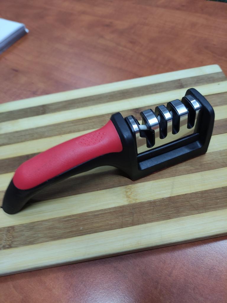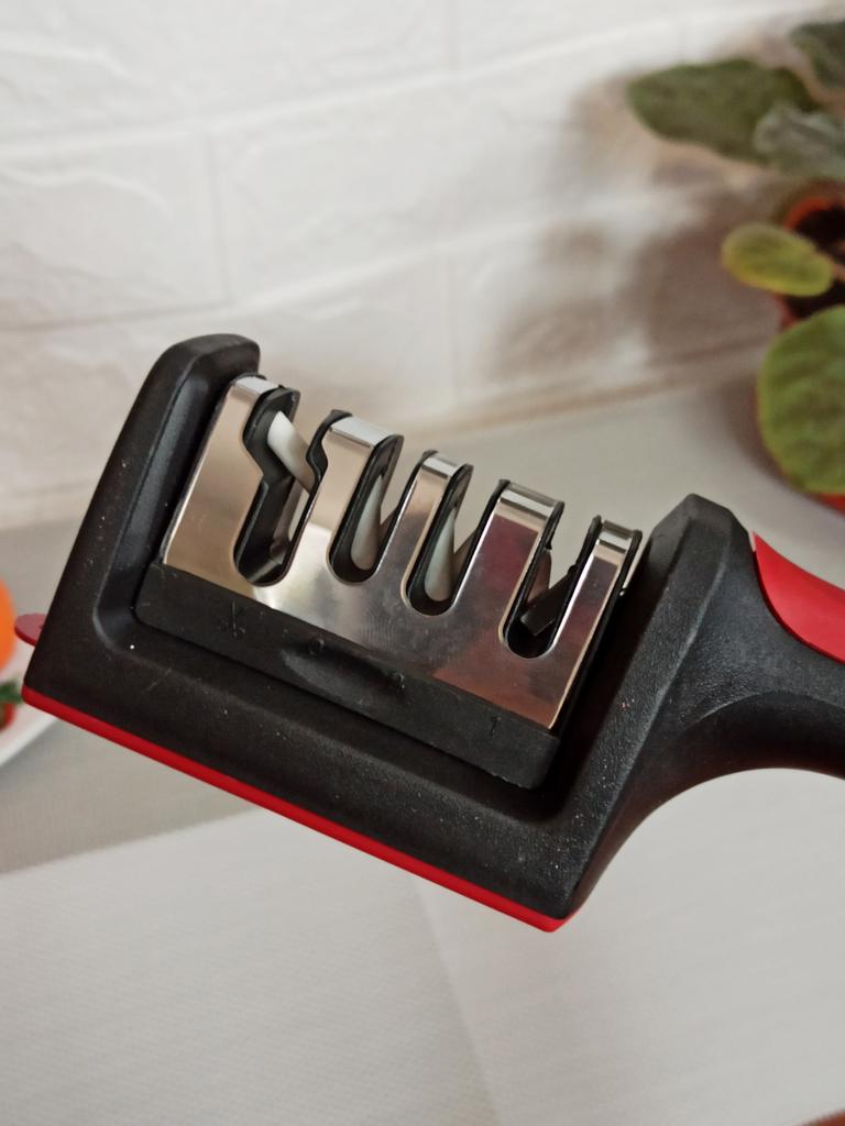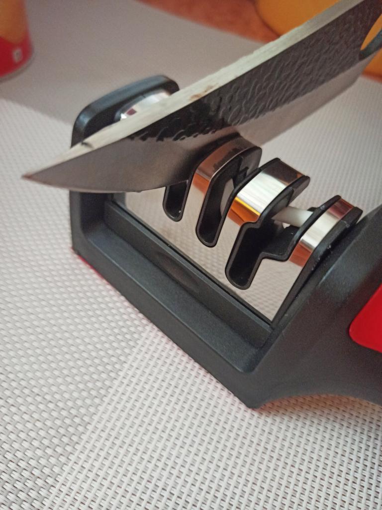 The knife definitely became sharper after sharpening, not so much, but better than it was 💯. Sharpening is easy. Comfortable handle, will be a good helper in the kitchen. Visually, the plastic is a little worn, but it does not affect sharpening. It just spoils the aesthetic look a little. It's okay, I'll use it.