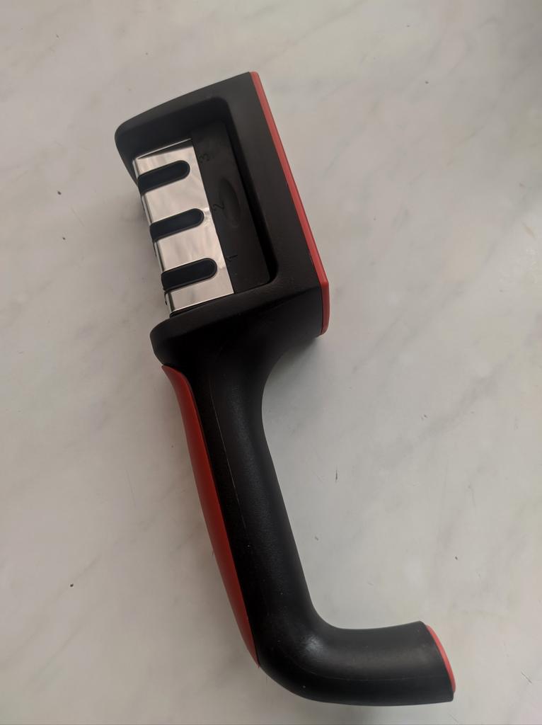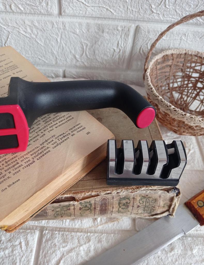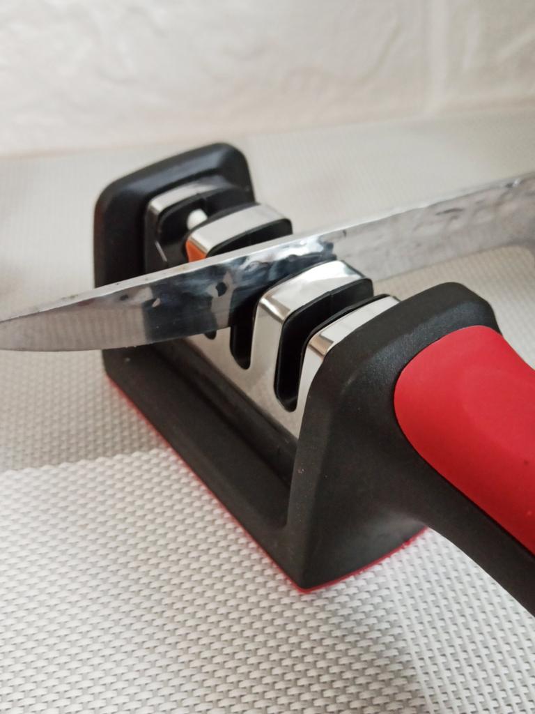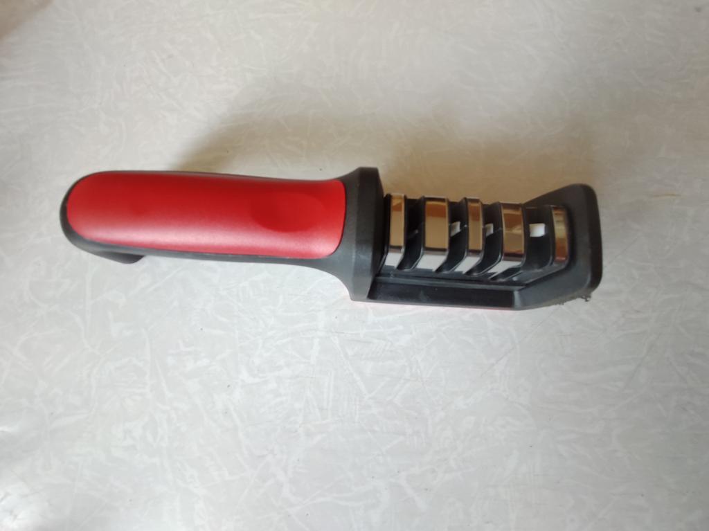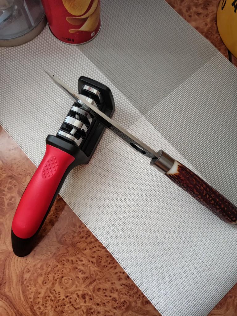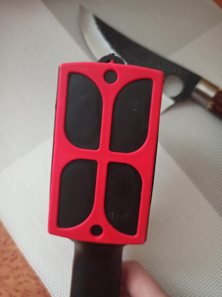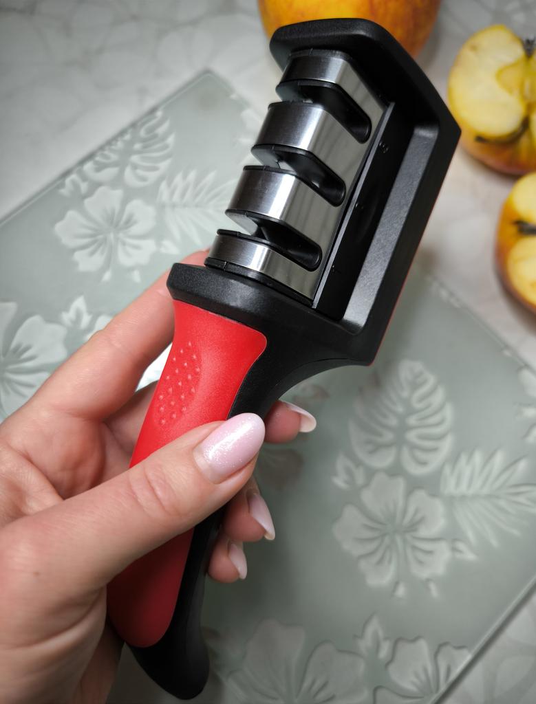 The knife definitely became sharper after sharpening, not so much, but better than it was 💯. Sharpening is easy. Comfortable handle, will be a good helper in the kitchen. Visually, the plastic is a little worn, but it does not affect sharpening. It just spoils the aesthetic look a little. It's okay, I'll use it.