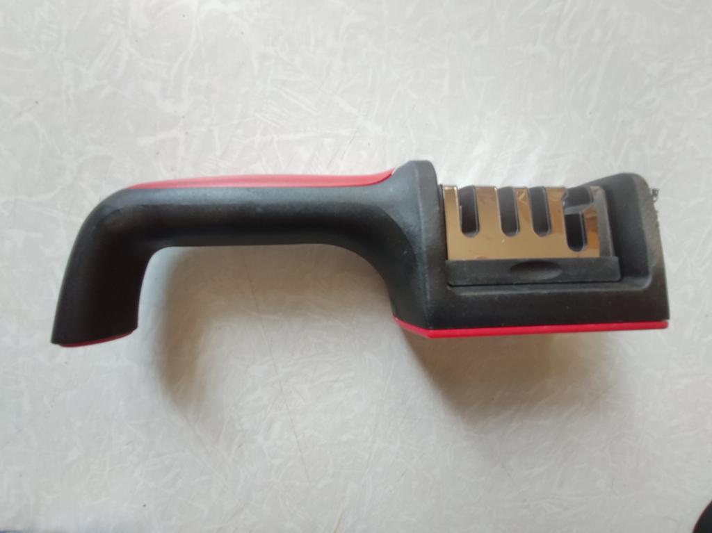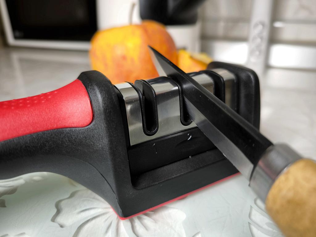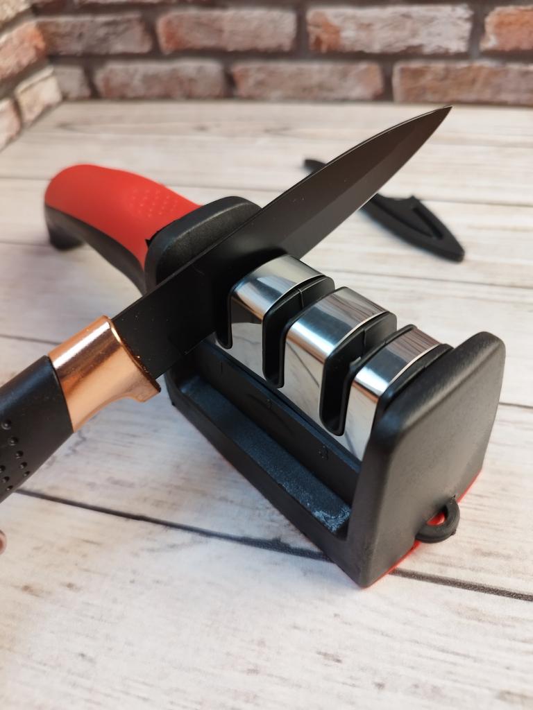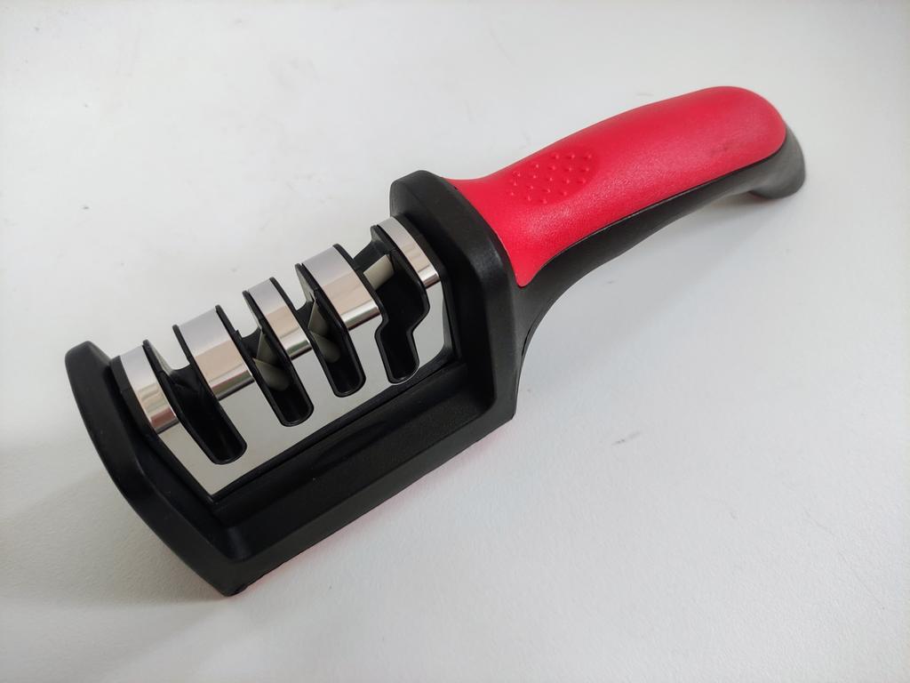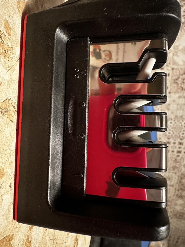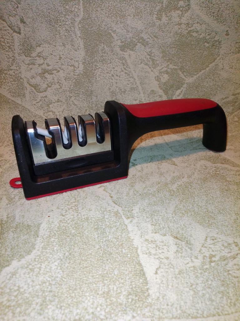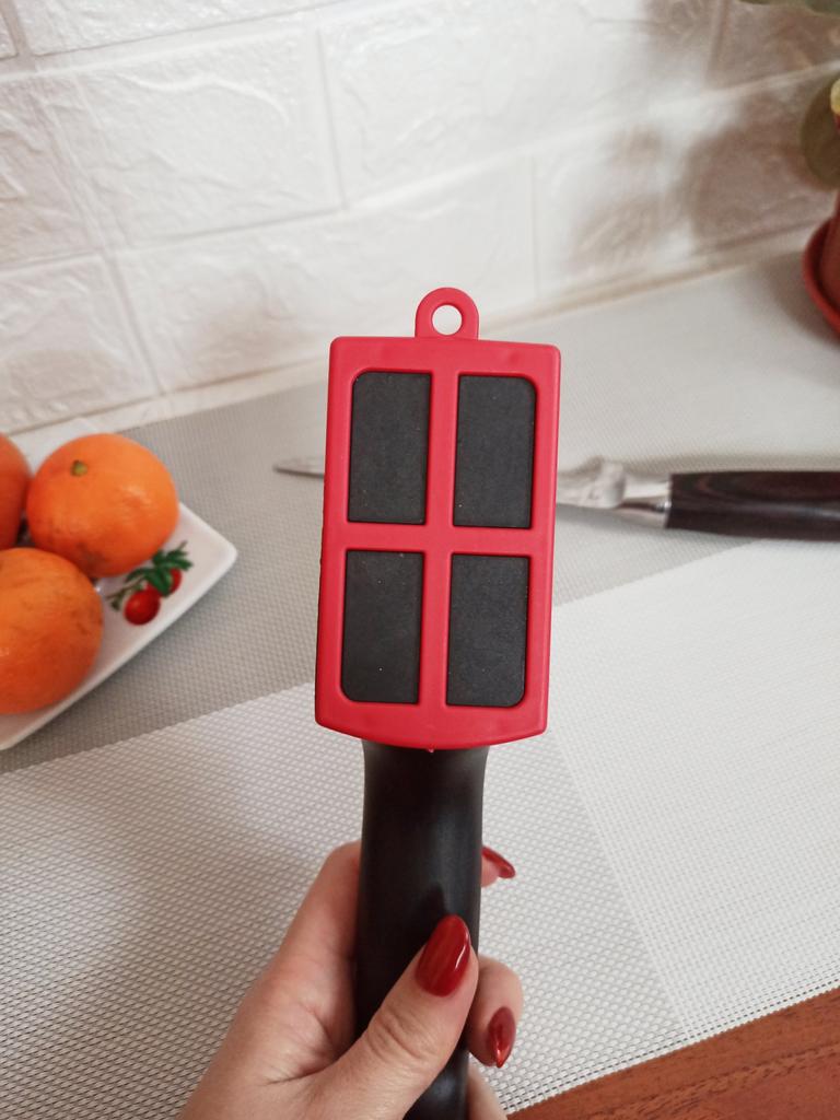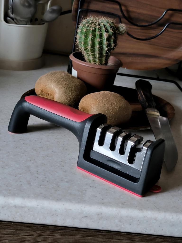 The knife definitely became sharper after sharpening, not so much, but better than it was 💯. Sharpening is easy. Comfortable handle, will be a good helper in the kitchen. Visually, the plastic is a little worn, but it does not affect sharpening. It just spoils the aesthetic look a little. It's okay, I'll use it.