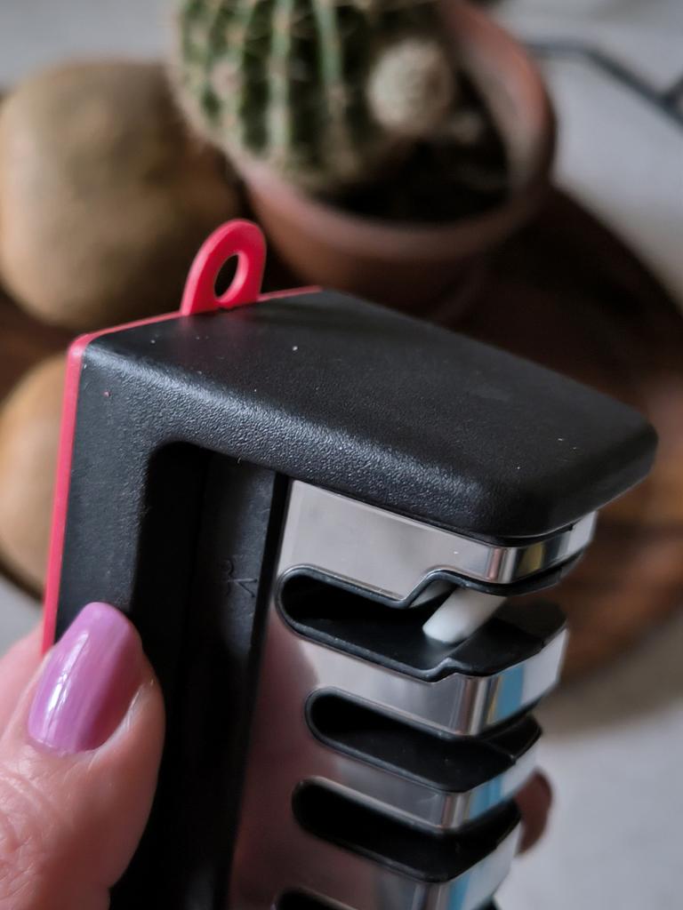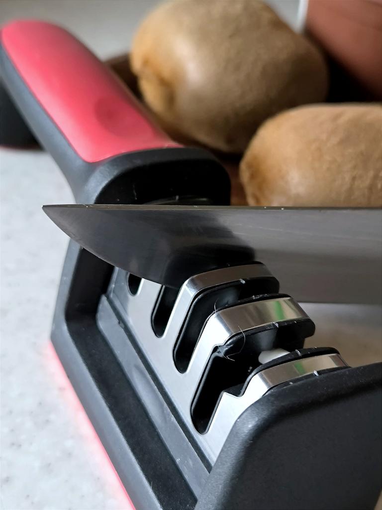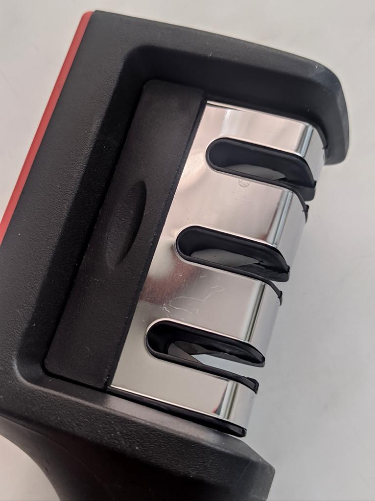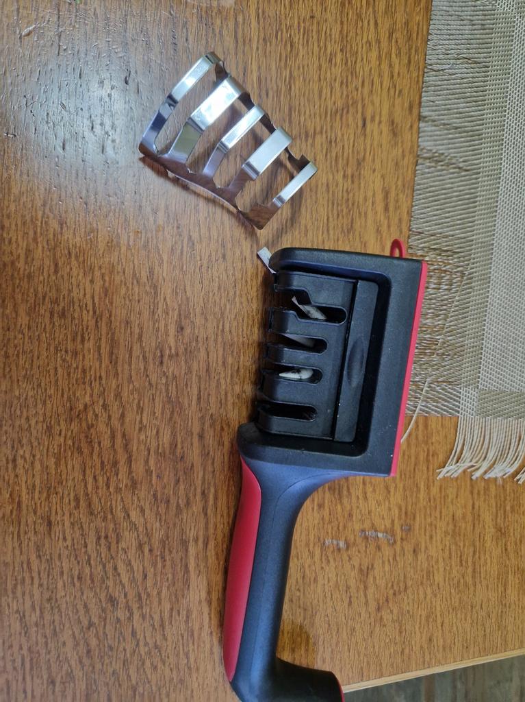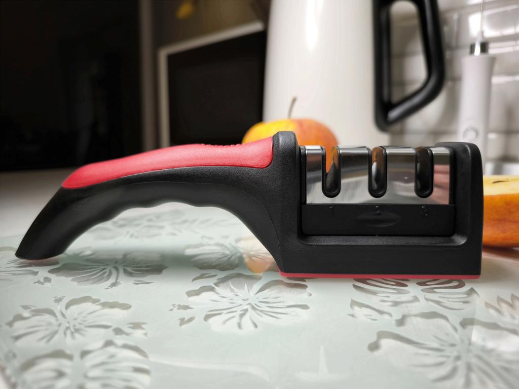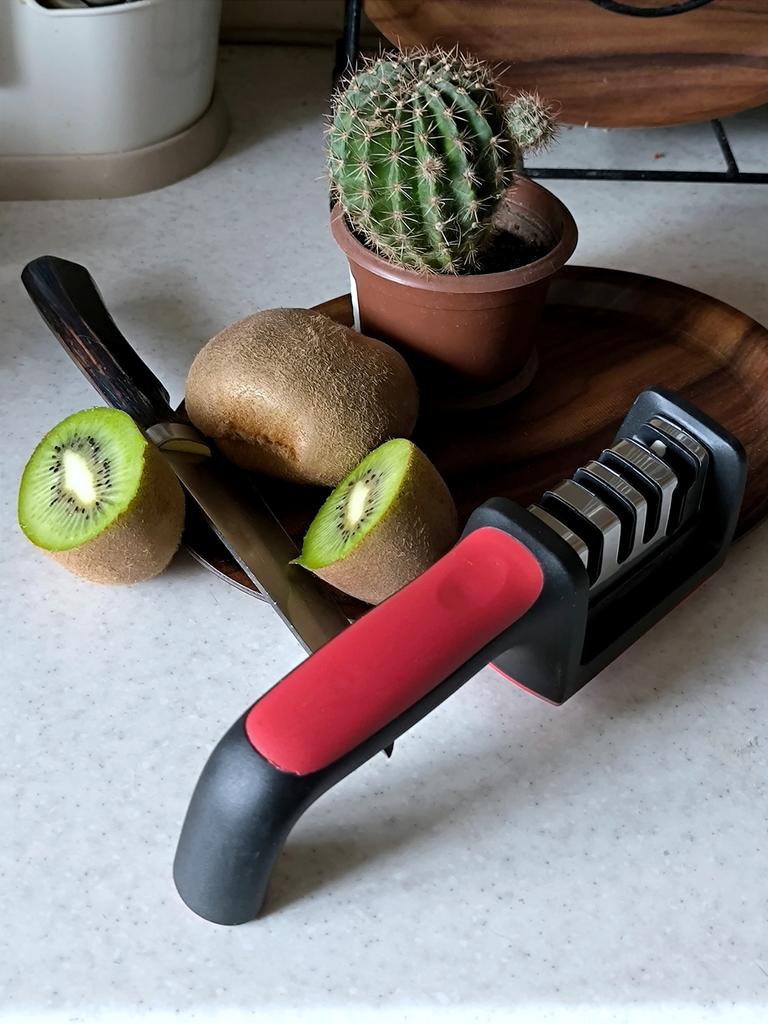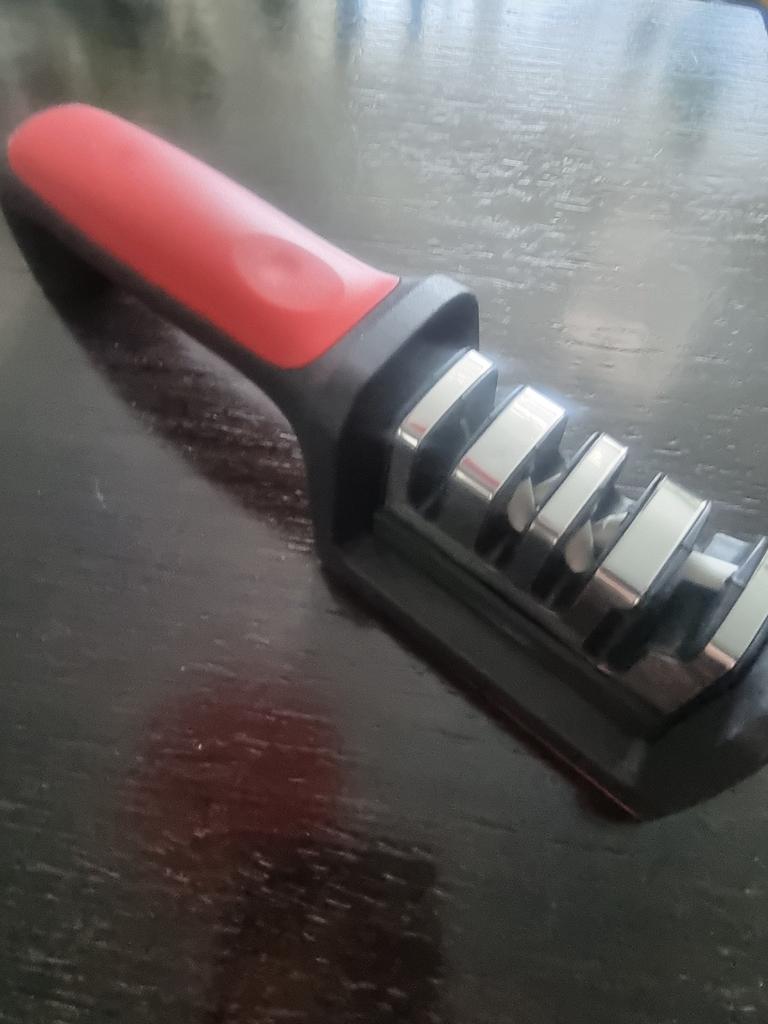 The knife definitely became sharper after sharpening, not so much, but better than it was 💯. Sharpening is easy. Comfortable handle, will be a good helper in the kitchen. Visually, the plastic is a little worn, but it does not affect sharpening. It just spoils the aesthetic look a little. It's okay, I'll use it.
