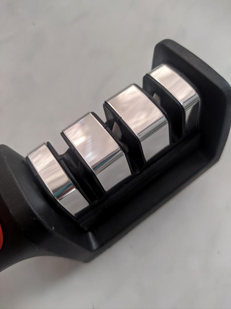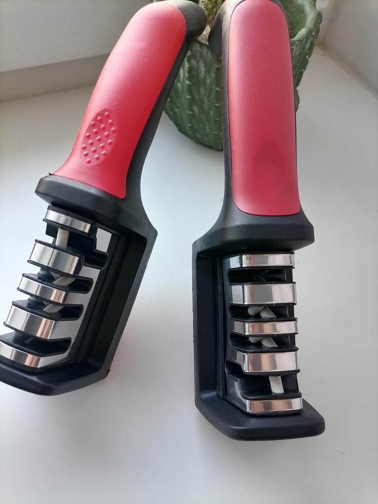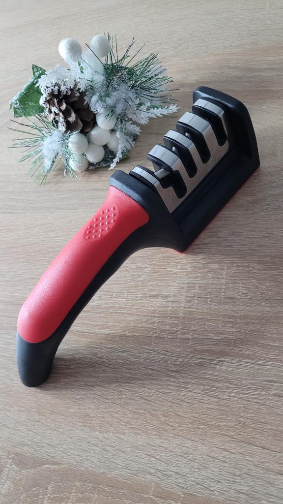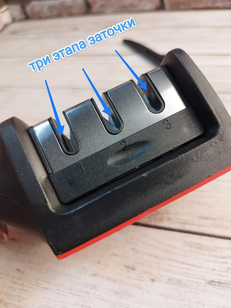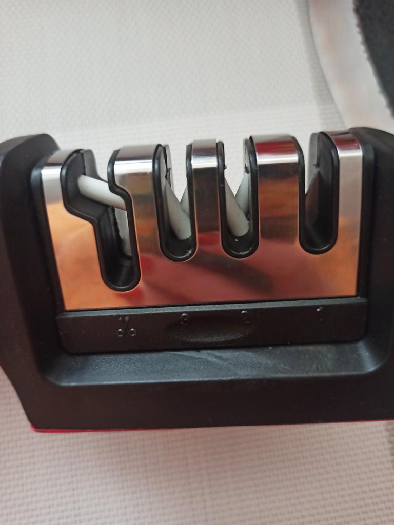 KNIFE SHARPENER from VISHUA brand Cool sharpener. Comfortable handle, fits perfectly in the hand. You need to sharpen a knife on this sharpener in three stages. The body has three compartments and stage numbers: 1, 2 and 3. In the first compartment there is rough sharpening with tungsten steel, in the second, medium sharpening with silicon carbide, in the third - grinding with fine-grained ceramics. Anti-slip rubber base, plastic comfortable handle, removable stainless steel and plastic handle. Sharpening knives in this sharpener is easy and simple. Knives are very sharp after sharpening. I recommend! 💯💯💯