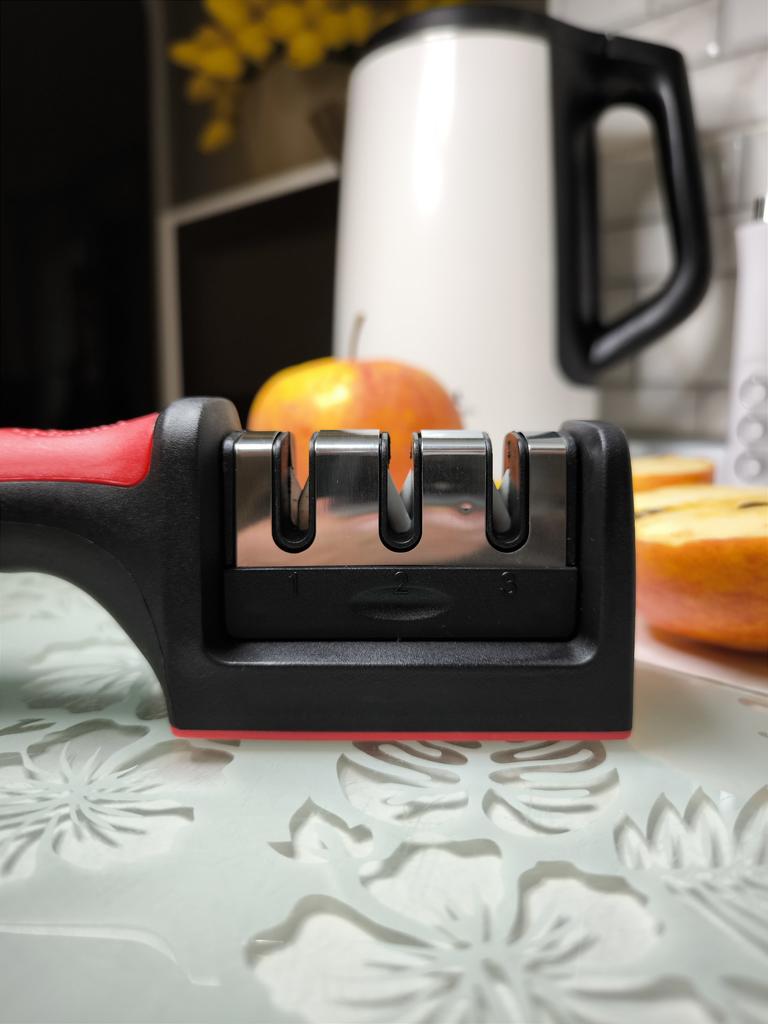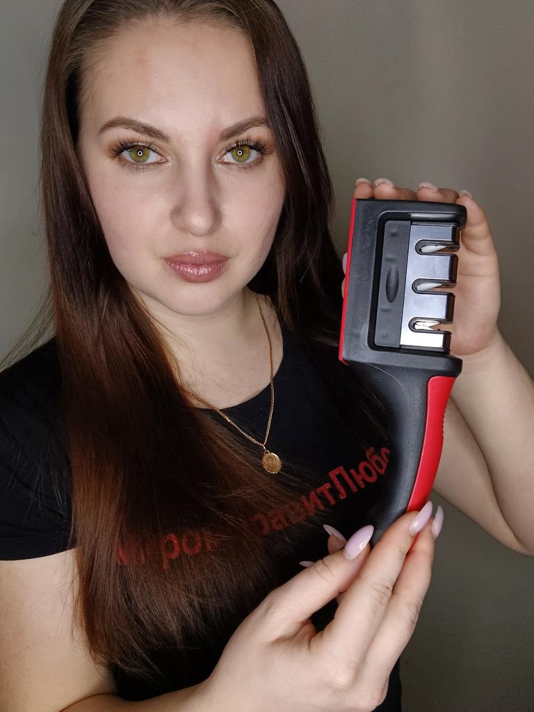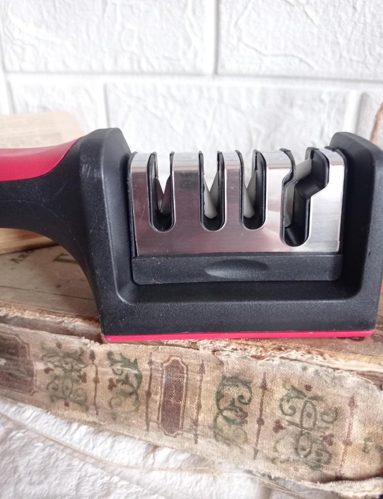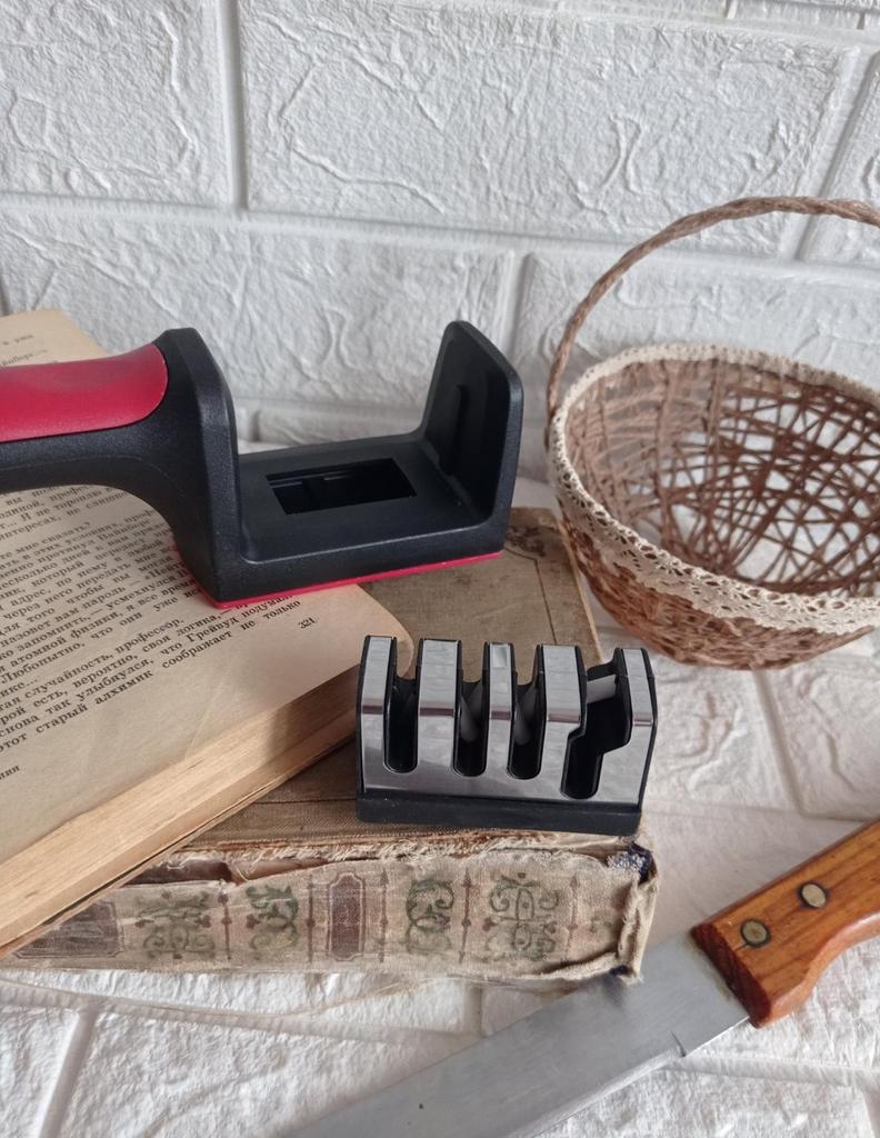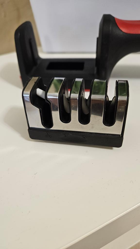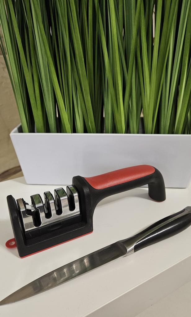 Sharpener for knives and kitchen scissors ! ✈️ The parcel took less than a month to Moldova. ✅Material: plastic body, metal . ✅ 3 reps. for sharpening knives and 1 hole. for sharpening scissors ✅Comfortable handle and silicone bottom to prevent the sharpener from slipping. ✅Excellent quality! ✅I’m happy with the purchase and definitely recommend it for purchase ❤️