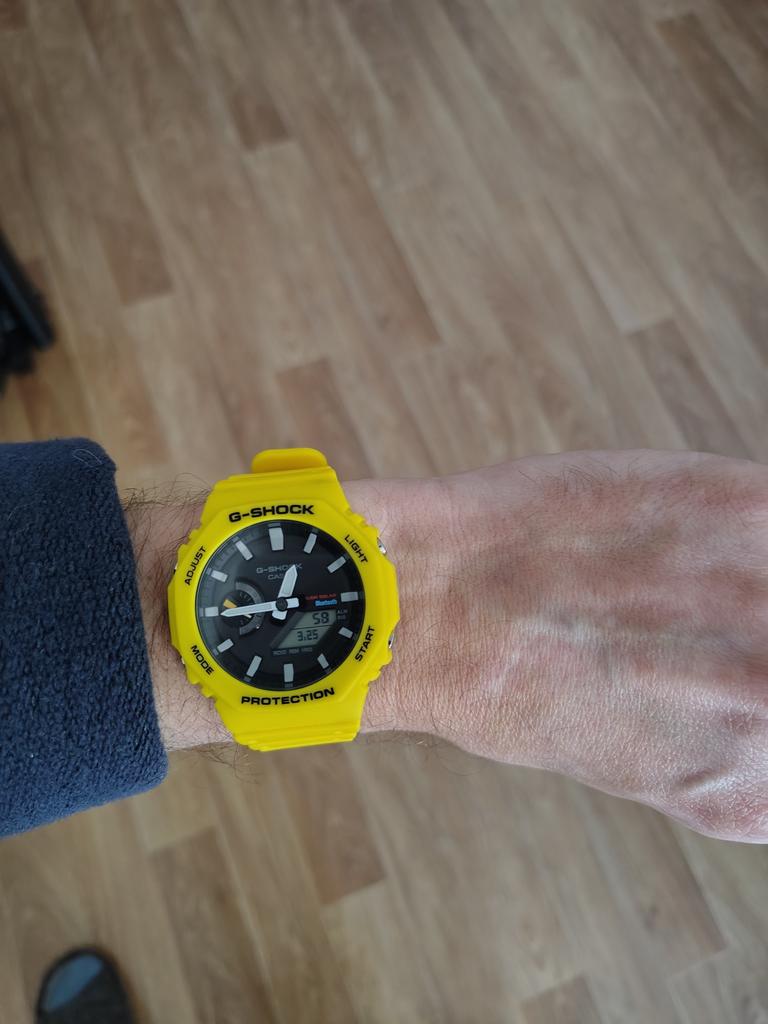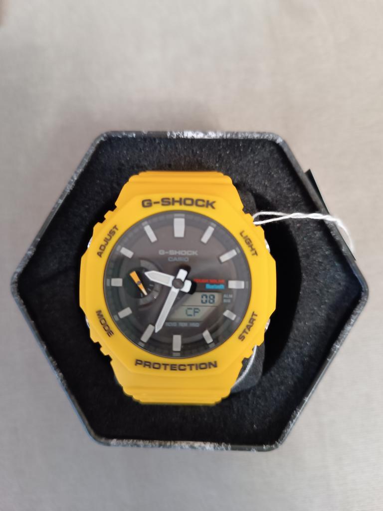 The Casio G-Shock GA-B2100C-9A is a dynamic fusion of advanced technology and bold design, built for those who demand resilience and standout style. Its vivid yellow resin strap exudes energy and toughness, perfectly complemented by the black dial that adds a touch of modern minimalism. Powered by Tough Solar movement, it ensures uninterrupted performance through light-powered charging, eliminating the need for frequent battery changes. The integrated Mobile Link function offers seamless Bluetooth connectivity, allowing for auto time adjustment and smartphone features like phone finder. Its analog-digital display is shielded by a mineral crystal and housed within a shock-resistant carbon core guard structure, making it ready for extreme environments. With 200-meter water resistance, it's ideal for aquatic activities and rugged adventures. Added features like world time, a 1/100-second stopwatch, a countdown timer, daily alarms, and a full auto-calendar enhance its practicality. Luminous hands, a hand shift feature, and a battery level indicator boost usability in all lighting conditions. Securely fastened with a buckle clasp and finished with a screwed case back, this watch is a bold, functional statement for the modern explorer.