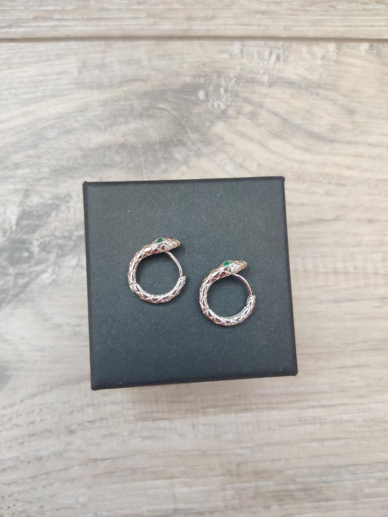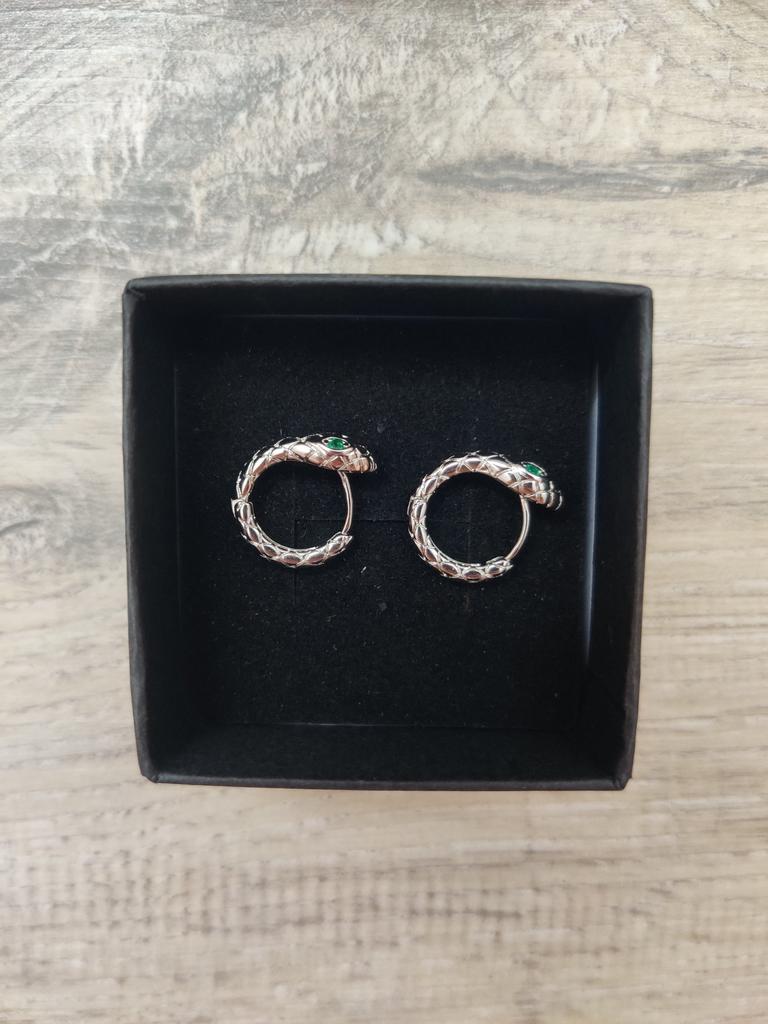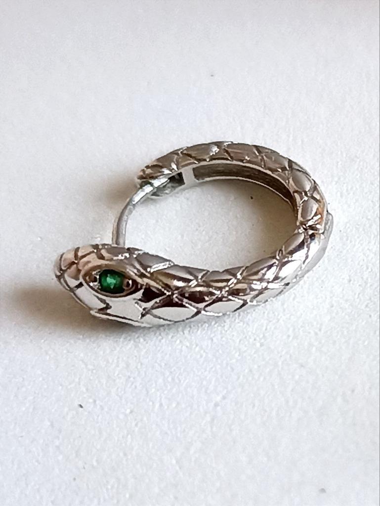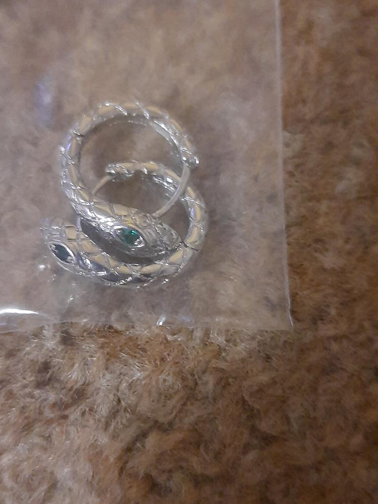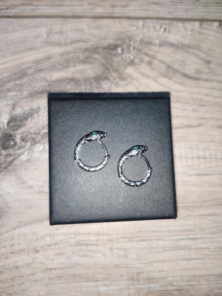 Snake EARRINGS Hoop earrings with small snake. The earrings arrived in Italy with tracked shipping in 12 days. Well wrapped in bubble wrap they arrived intact. packaging: small zipped plastic bag. Classic shape, a small silver-coloured ring, snake-shaped with a small green stone set. Very light, they don't bother you. Steel material. Dimensions of the circle: diameter approximately 17 mm. The closure is tight. The earrings have no flaws and appear to be of very good quality. I recommend the purchase 👌👌👌