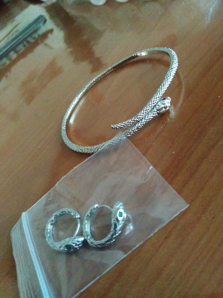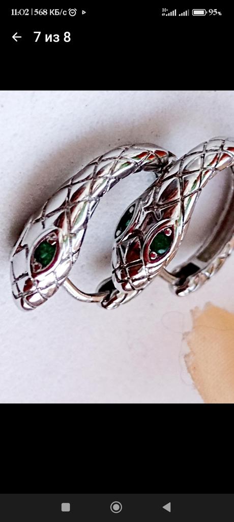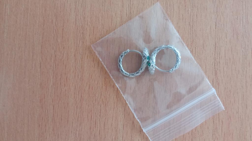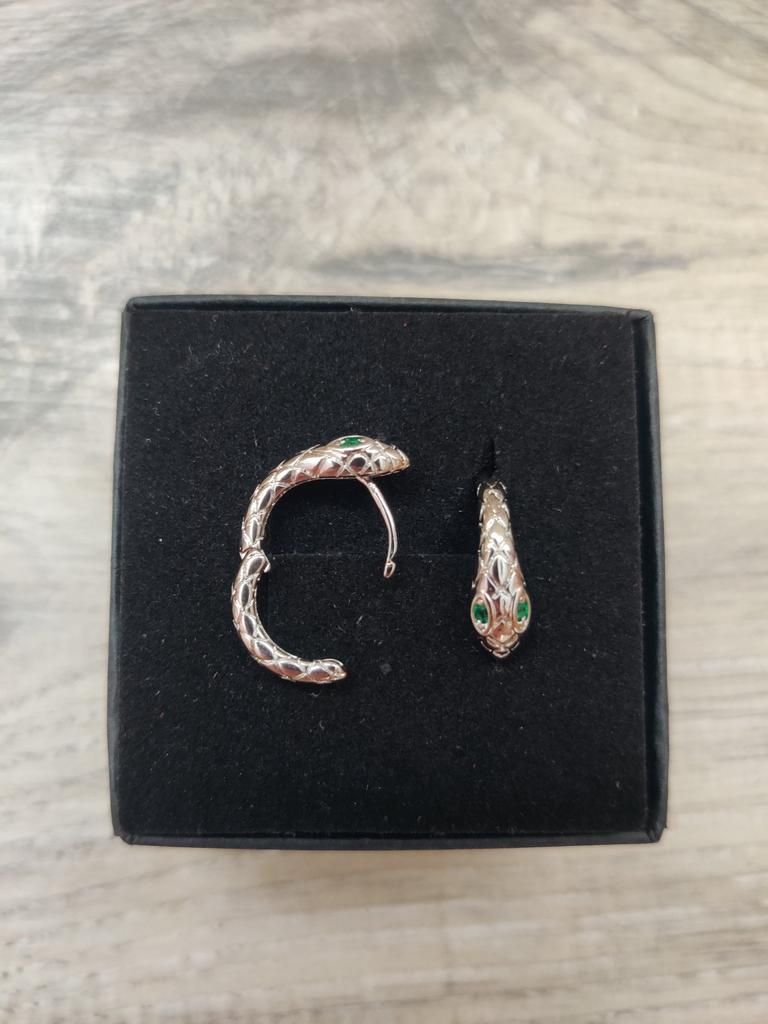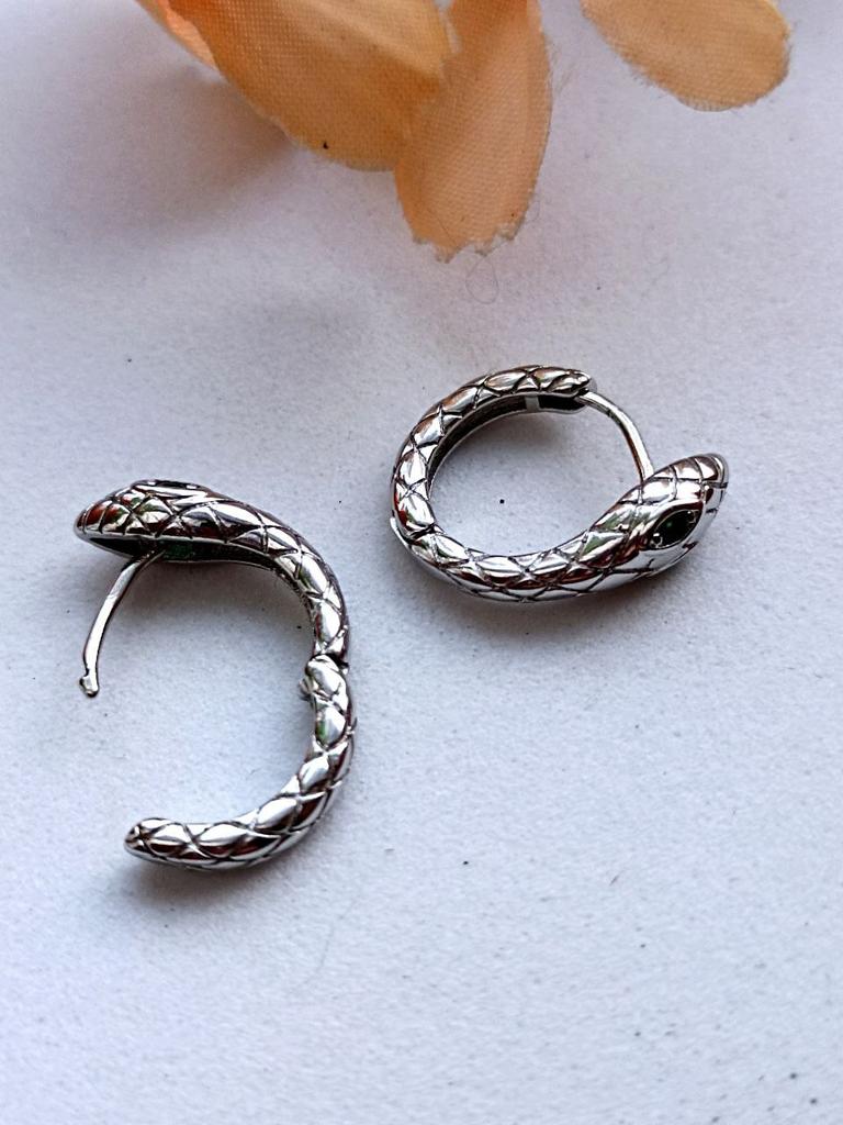 Snake EARRINGS Hoop earrings with small snake. The earrings arrived in Italy with tracked shipping in 12 days. Well wrapped in bubble wrap they arrived intact. packaging: small zipped plastic bag. Classic shape, a small silver-coloured ring, snake-shaped with a small green stone set. Very light, they don't bother you. Steel material. Dimensions of the circle: diameter approximately 17 mm. The closure is tight. The earrings have no flaws and appear to be of very good quality. I recommend the purchase 👌👌👌