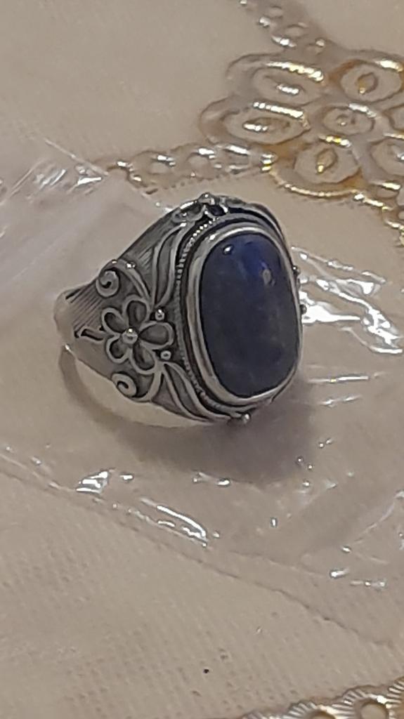 Beautiful ring. The blue stone and silver frame complement each other. Very nice. Thank you