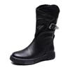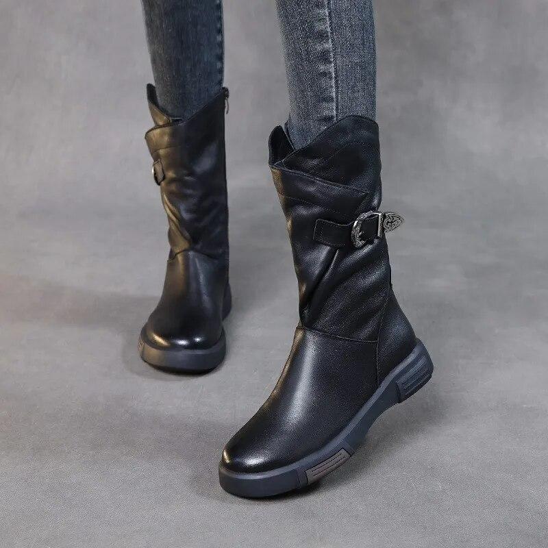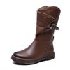 Johnature Genuine Leather Flat Mid-calf Boots For Women's Vintage Solid Color Side Zippered Boots