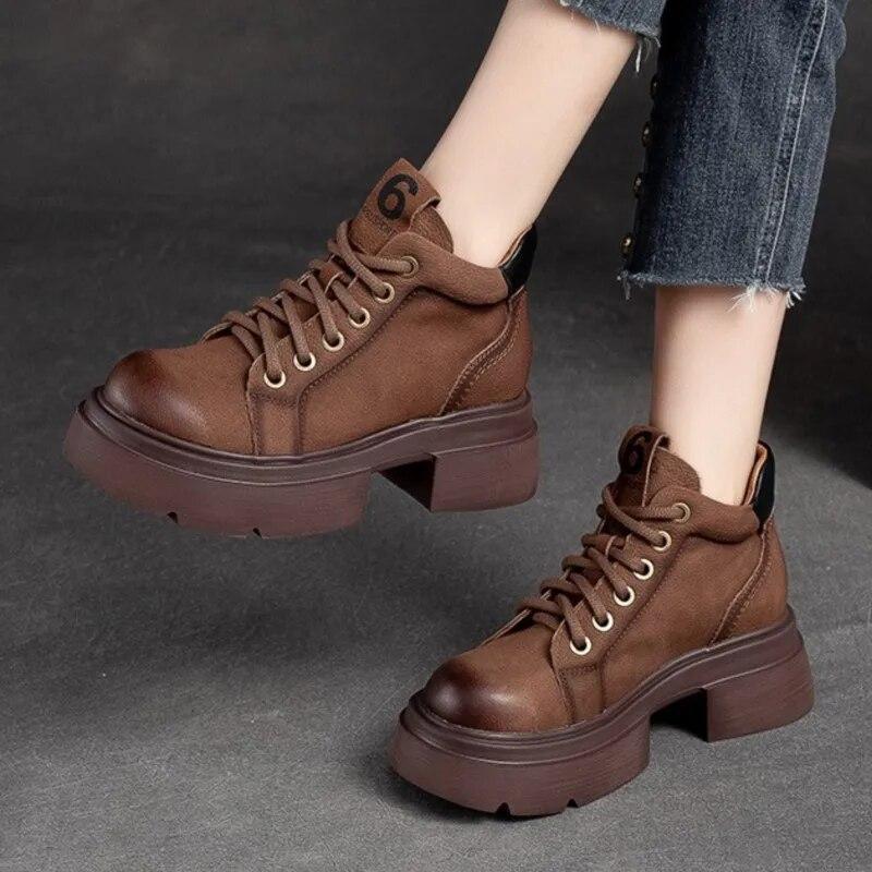 Johnature Retro Genuine Leather Lace-up Short Boots Round Toe Thick Sole Casual Versatile Women's Shoes