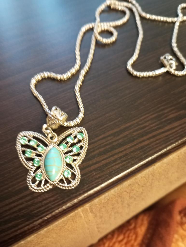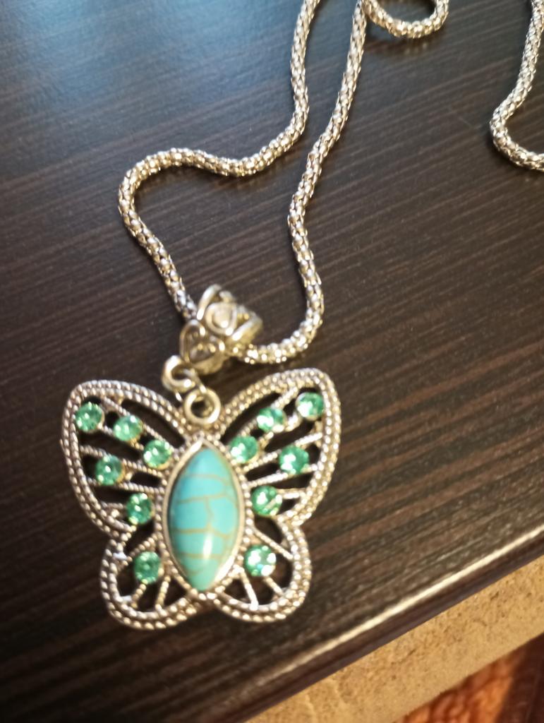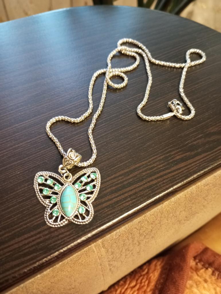 Women Retro Turquoise Butterfly Hollow Rhinestone Inlay Pendant Tibetan Necklace
