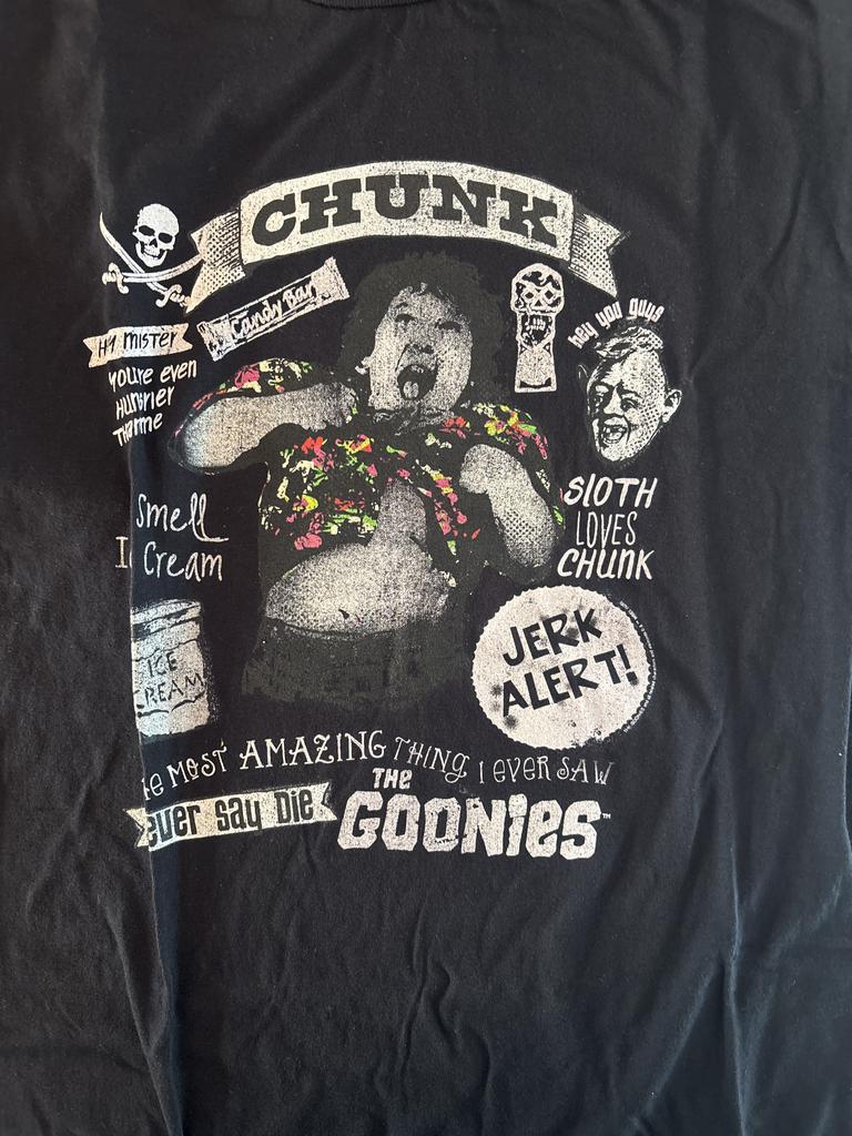 The t-shirt has a defect on the word Goonies, specifically the o and the n are missing color, and also the image of Chunk is completely faded, not conforming to the photograph. I am not at all satisfied with the item and wish to return it.
