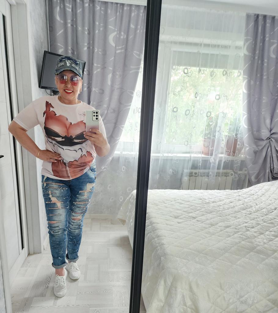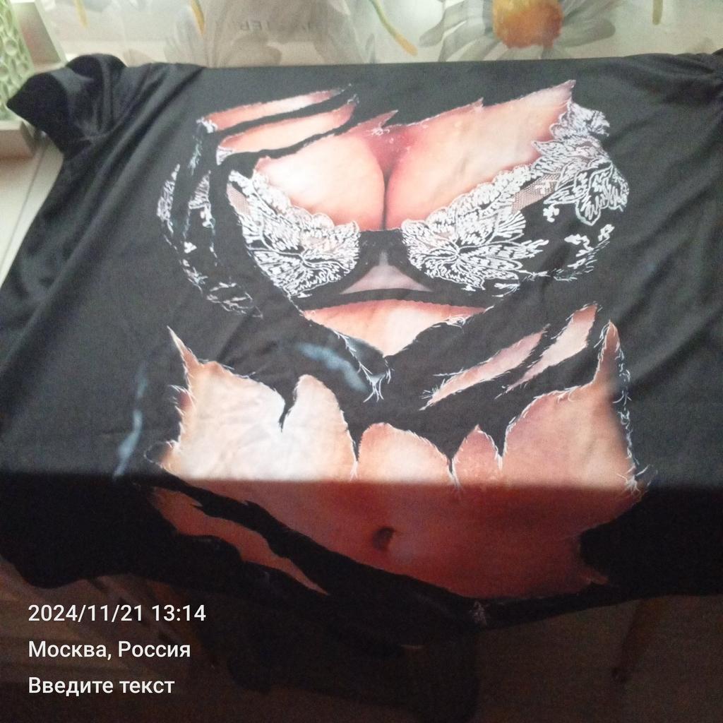 The T-shirt fits size 48. The quality is good, the fabric is not cotton, it feels silky