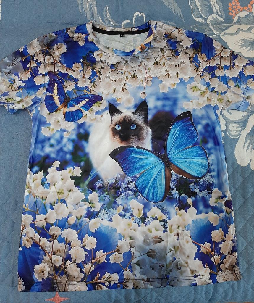 Charming T-shirt with cats, size 48 is normal, not too small.