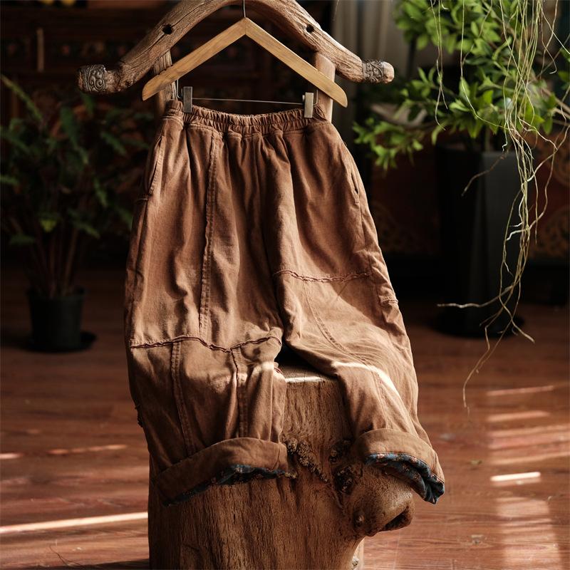 Johnature Women Vintage Plus Cotton Wide Leg Pants Green Warm Elastic Waist Winter Trouser Patchwork Loose Pants