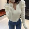 Autumn and Winter Temperament V-neck Bubble Sleeves Bottom Shirt Women's Slim Fit Knitted Shirt French Tight Waist Top
