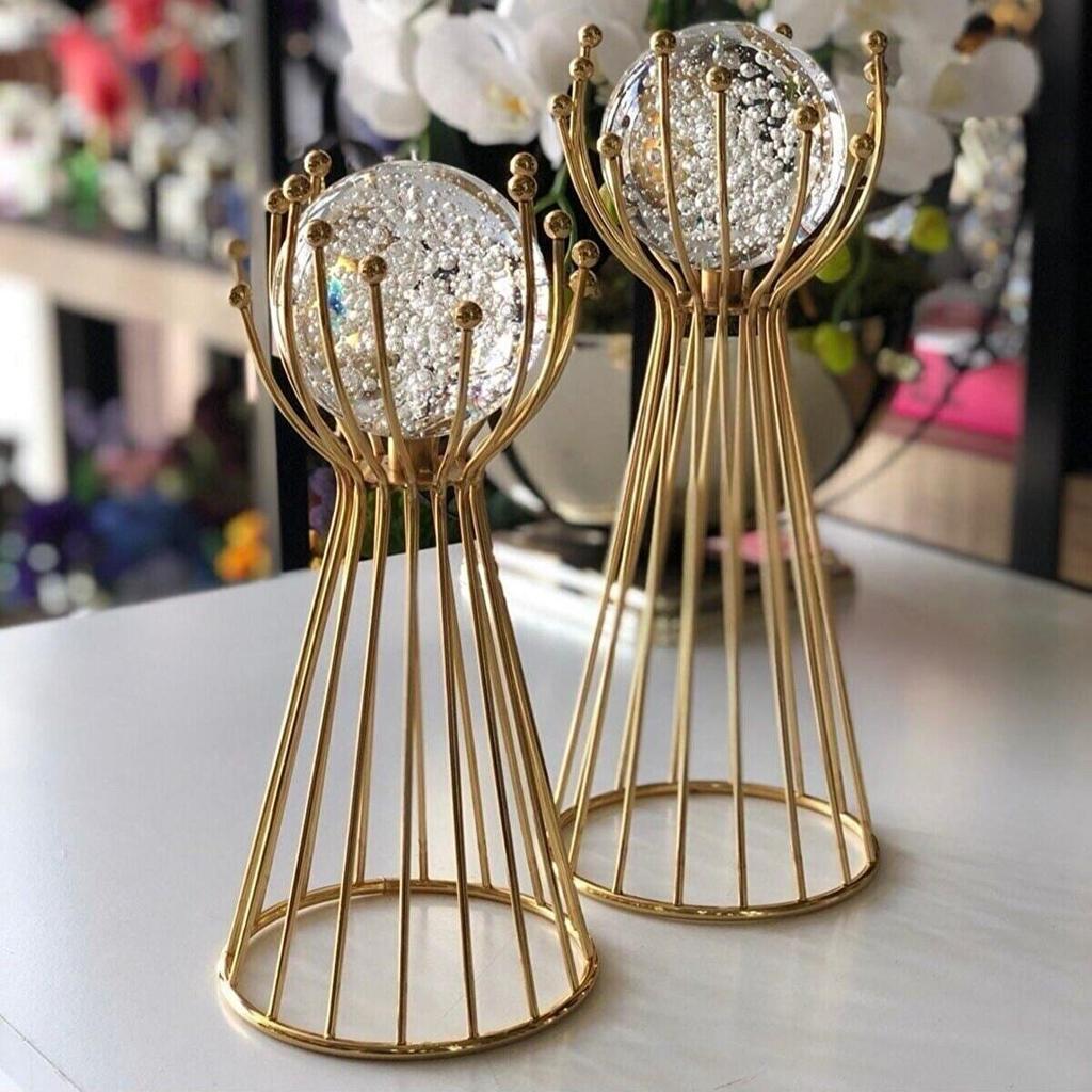 Decorative Accessories Set of 2 Marbles and Bubble Spheres with Metal Legs Gold Color