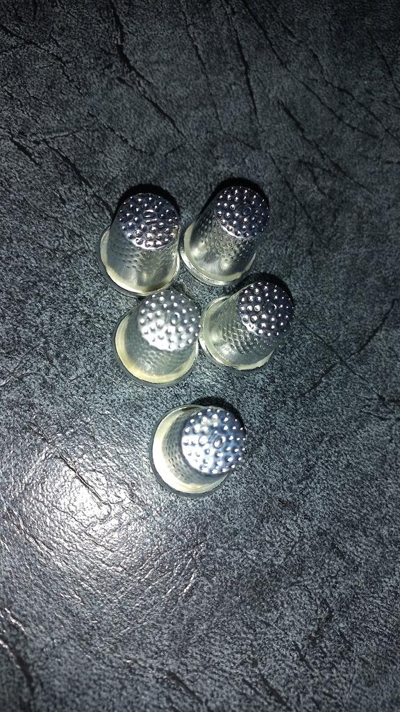 Thimbles are put on the middle finger of the right hand... And these little ones are only put on the little finger