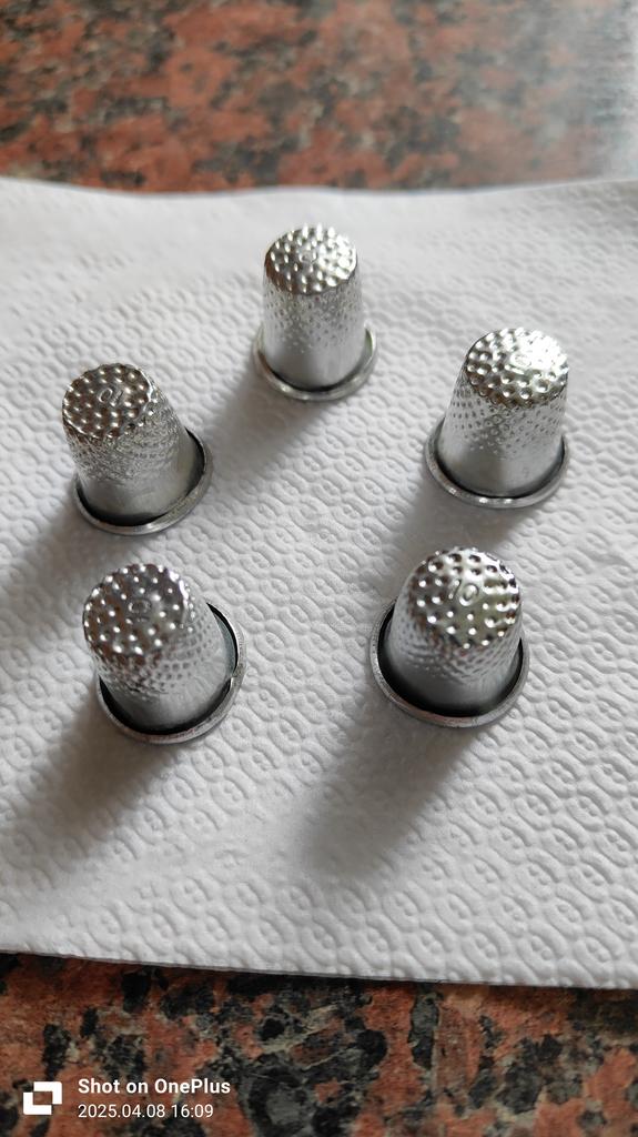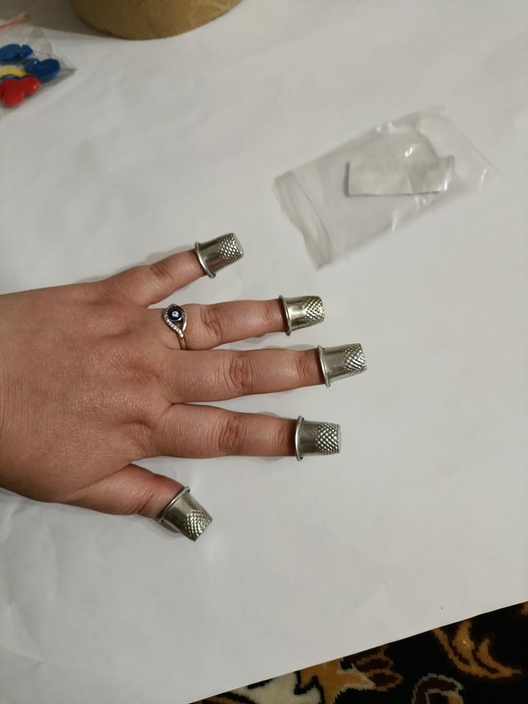 Out of five pieces, none fit. I have thin fingers and the thimbles are loose. There should be different sizes. I am not satisfied at all.