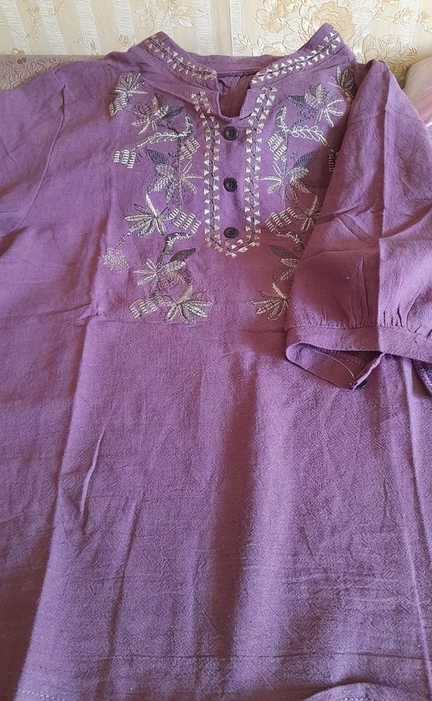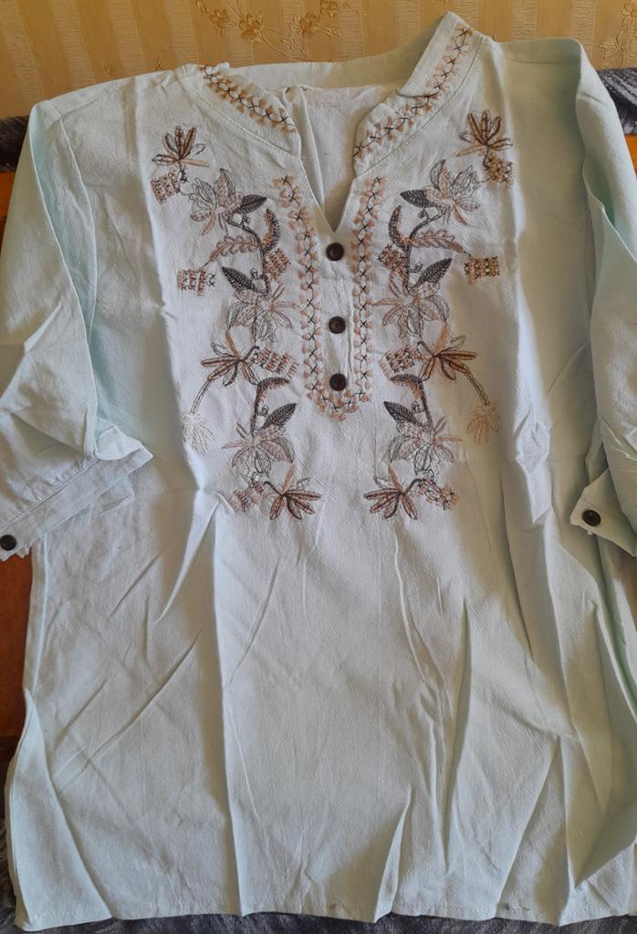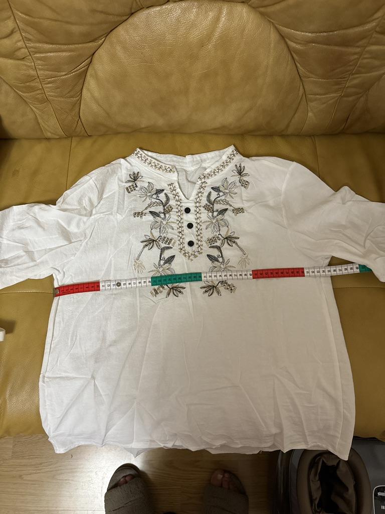 The size fit our 46, a good blouse with embroidery, but the neckline was not embroidered a little, you need to finish it yourself, and remove the threads everywhere, but I will wear it