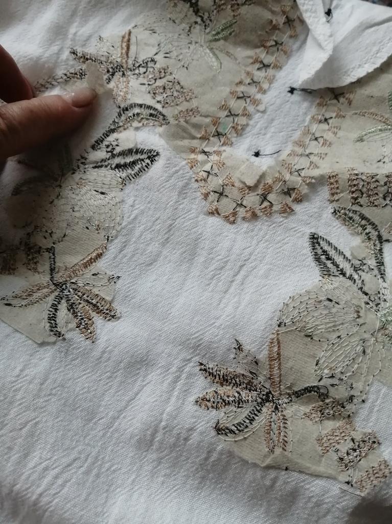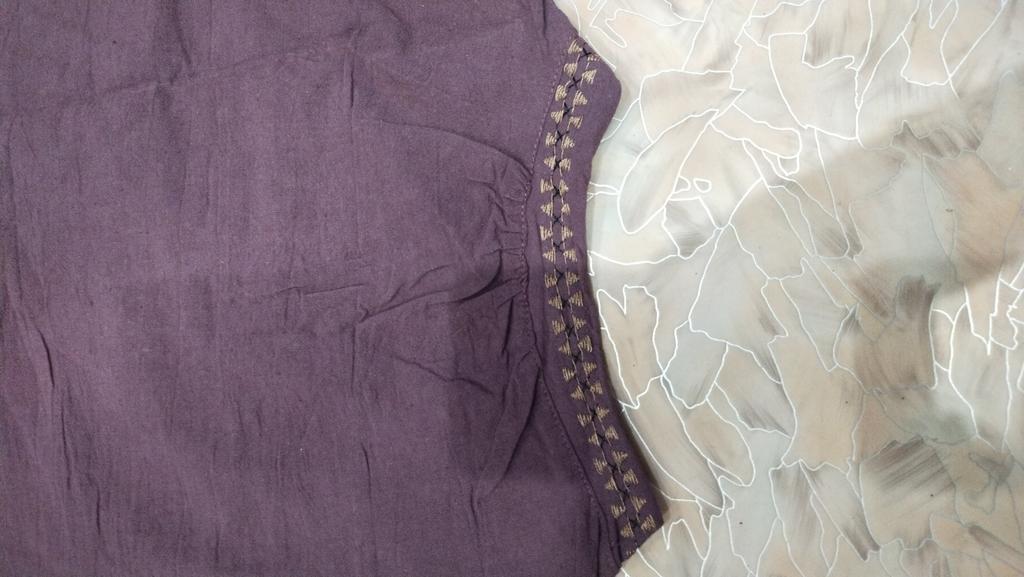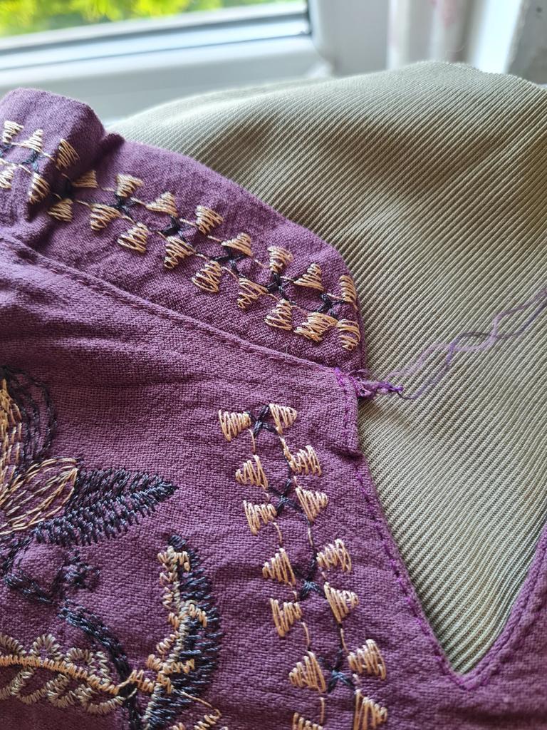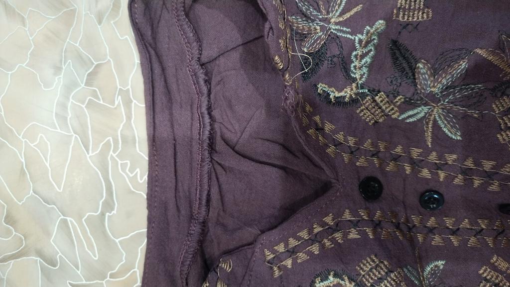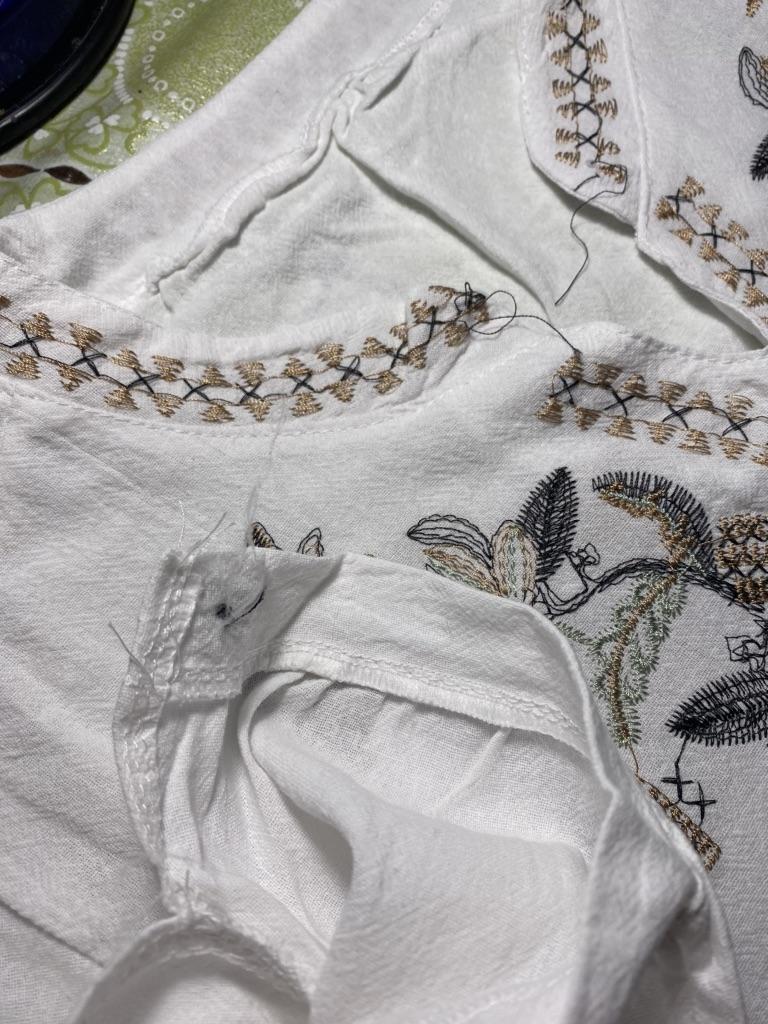 Threads are sticking out on the embroidery and along the seams, the blouse is dusty, the neckline is too loose in one place, the front facing is not overlocked.