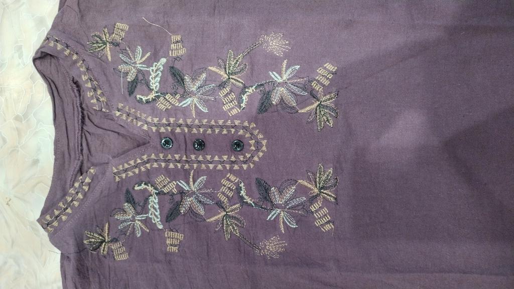 The fabric is good, the embroidery too. But sewing... The threads stick out. The neck is crooked. We need to change it. The size fits my size 52-54.