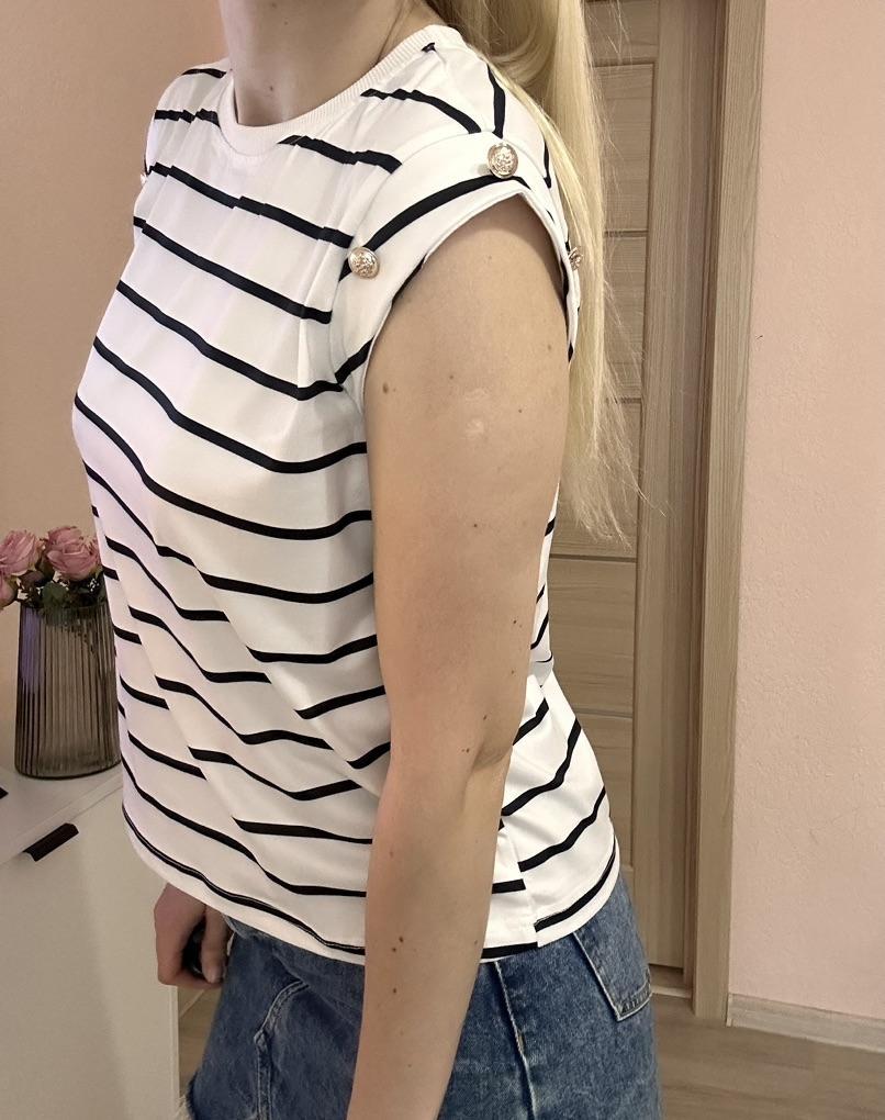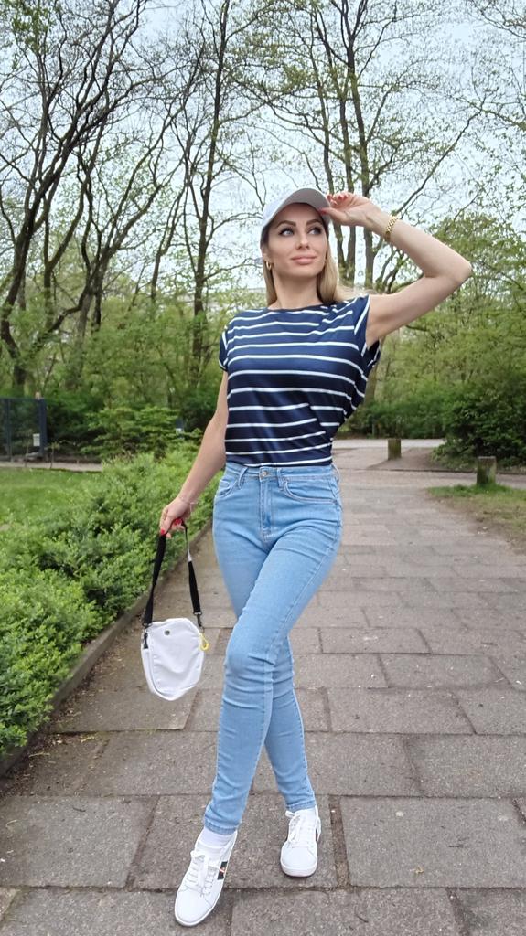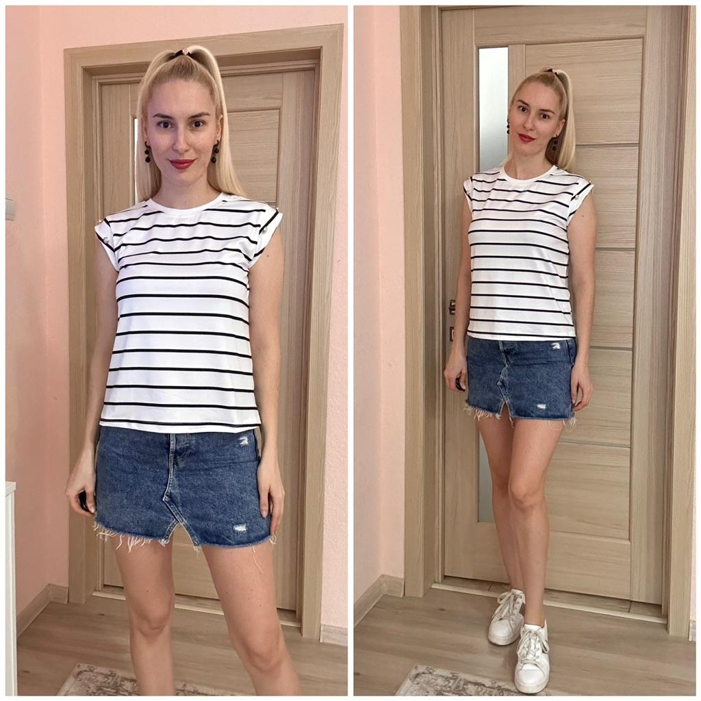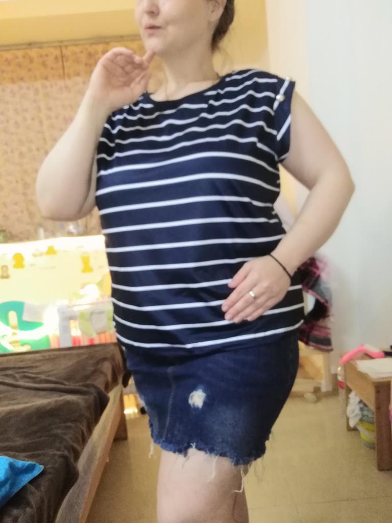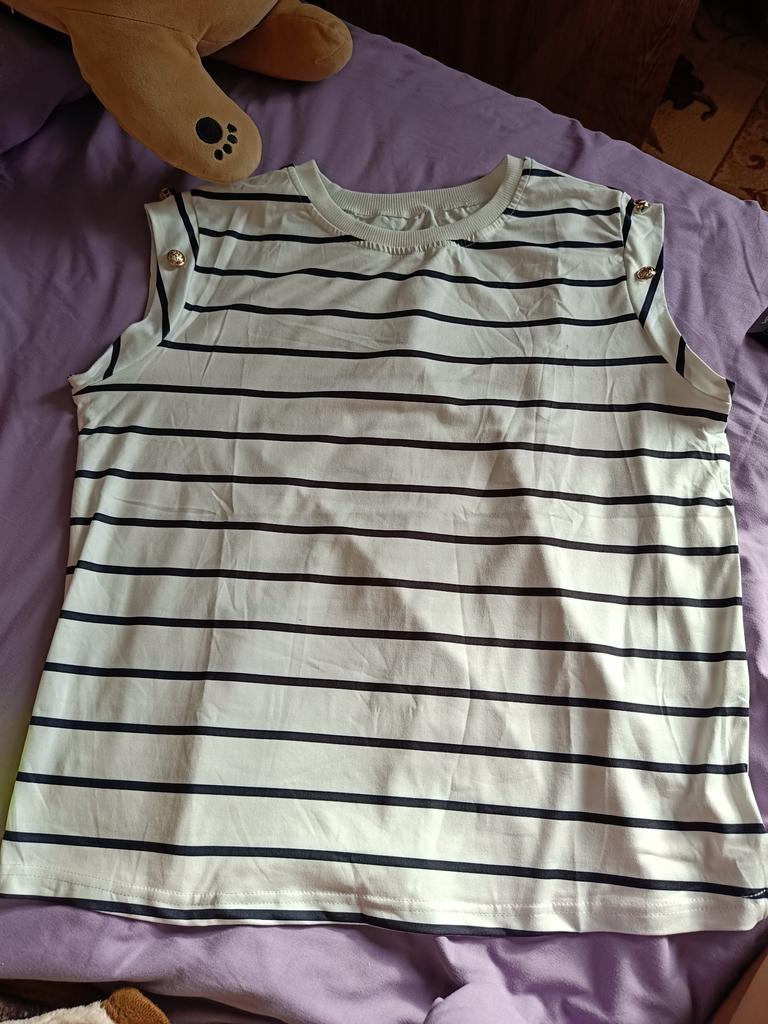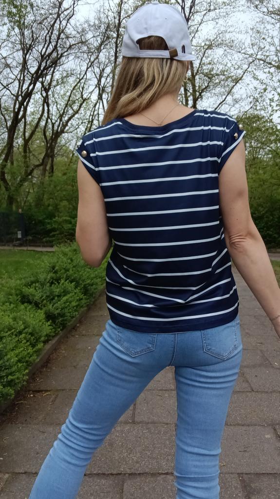 Beautiful striped t-shirt with buttons on sleeves 👌👌👌💯❣️ ❇️Delivery time: 42 days to Germany. The delivery was delayed, but I received a discount as an apology. Scope of delivery: The delivery includes a beautiful T-shirt in the appropriate color and size. The product is available in 4 different colors. It is available in sizes S to XL. I ordered the product in blue and it fits me perfectly and looks very nice!👌💯💯💯💋. My measurements are 90-65-90cm and 167cm tall. The product fits me perfectly 💯!. Very nice quality!!!👌👌👌👌 Stretchy and opaque!❣️👌I especially like the striped pattern and the sleeves with buttons. The buttons are just for decoration. Material composition: 95% polyester and 5% elastane. I am very satisfied with my order!👌💯💯🌷 5 stars 🌟 🌟 🌟 🌟 🌟 hands down. Thanks Joom and the seller!❣️